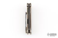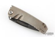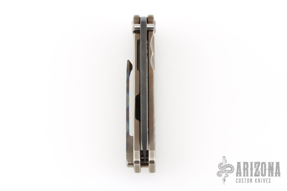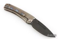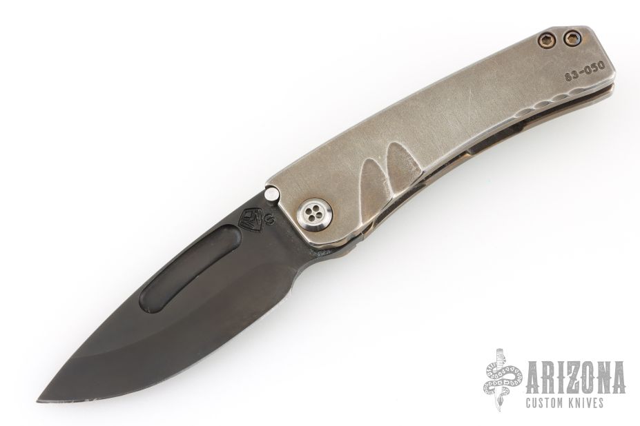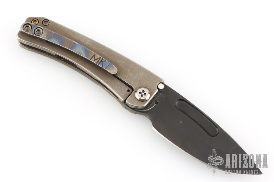 This Dress Marauder from Medford Knife and Tool features a black finished drop point blade with fullers. The handle is comprised of bead blasted and tumbled titanium frame over titanium barrel spacers, anodized titanium tip up clip. Has scuffs and scratches, good condition otherwise.