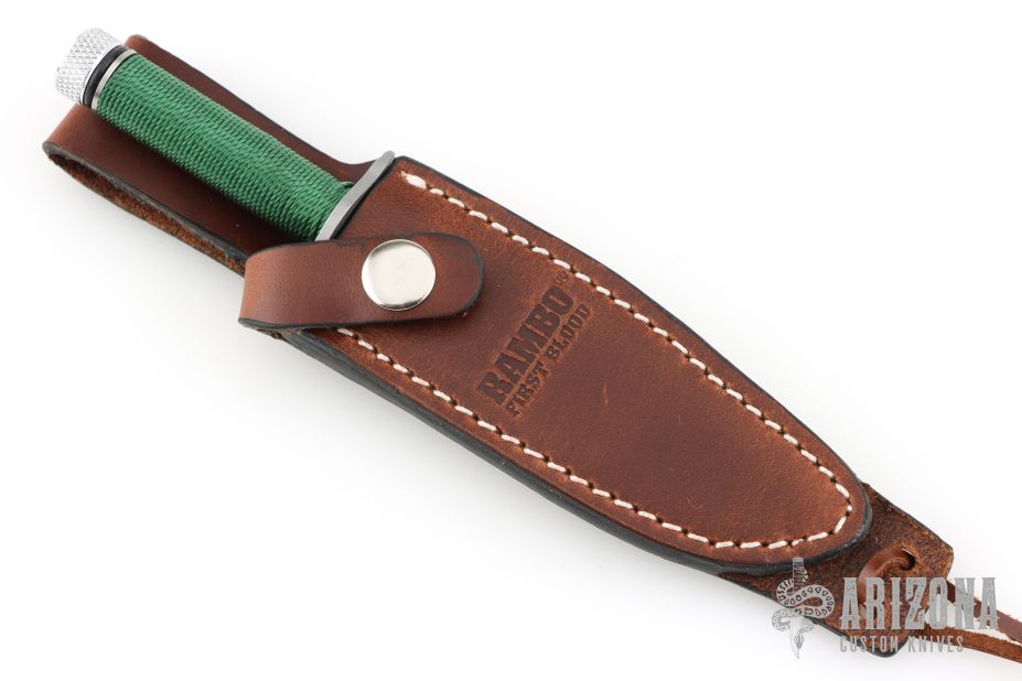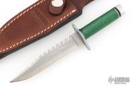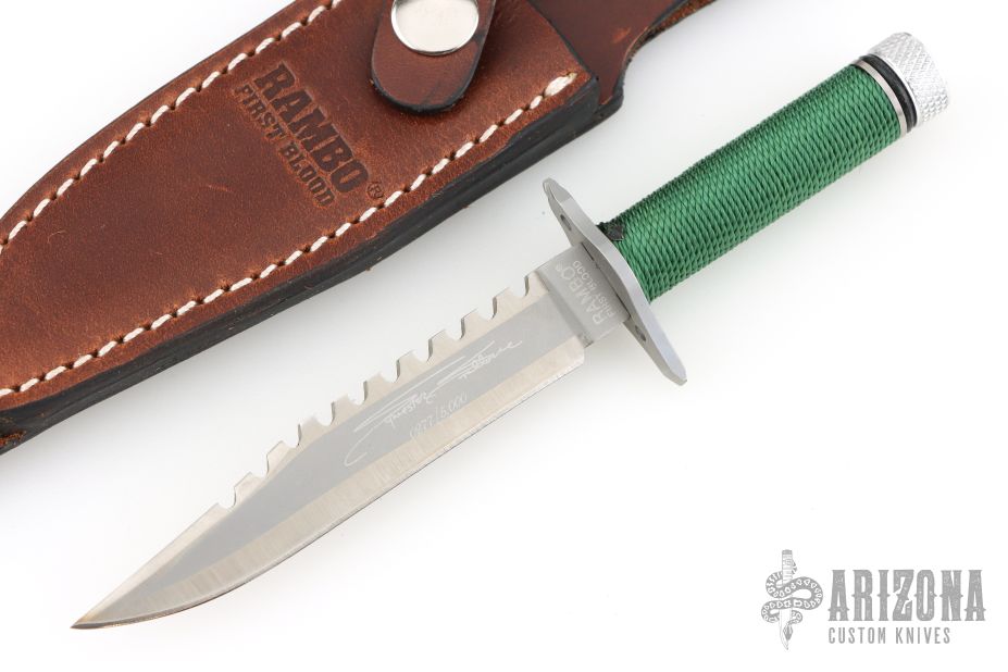 This Scale Miniature Rambo First Blood knife is a Sylvester Stallone Signature Edition and is #277/5000. This was made by Hollywood Collectibles Group and Master Cutlery. It has a two tone blade with sawteeth on the spine, .106" blade stock and .567" blade depth, hidden tang construction. The handle has a blasted stainless steel guard with phillips and Flathead ends, green cord wrap over a stainless steel handle with an aluminum butt. Comes with original box, COA and brown leather sheath. New from maker. New old stock.