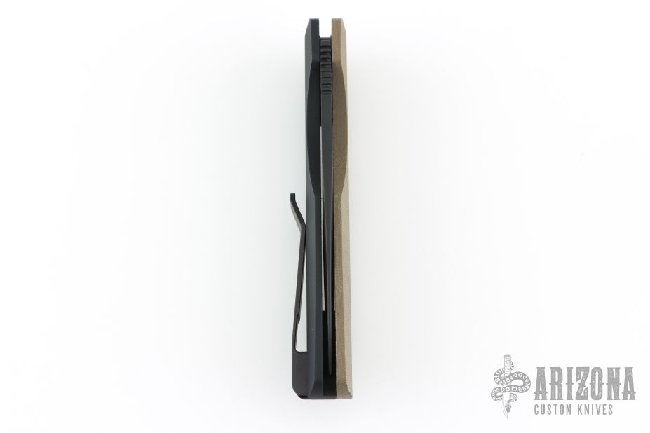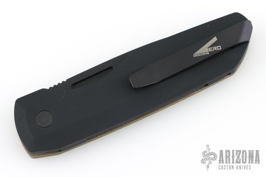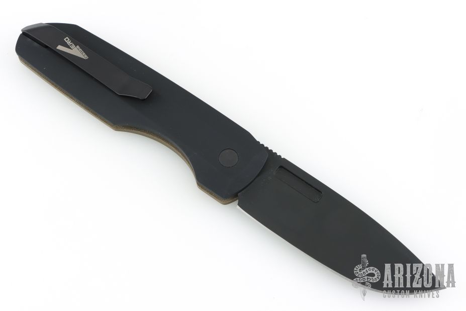 This Synapse LTD by Pro-Tech is a Vero Engineering design. It has a black finished blade with notched thumbrest. The handle has a green linen micarta and black aluminum frame, black push button, tip up black titanium clip with hidden screws. Comes with original box, pouch and papers. New condition.