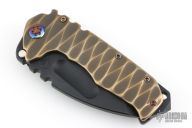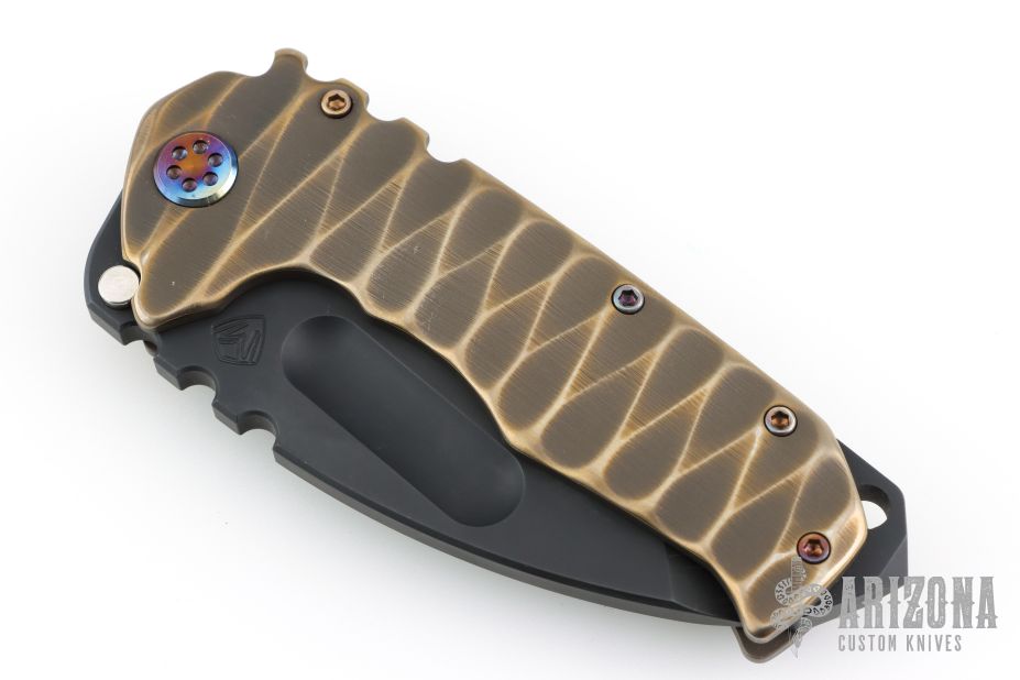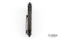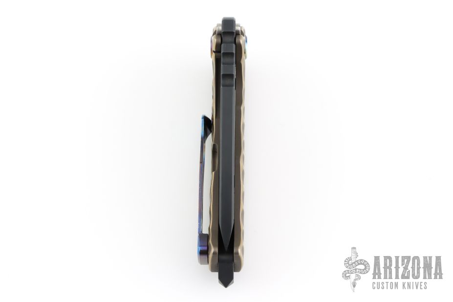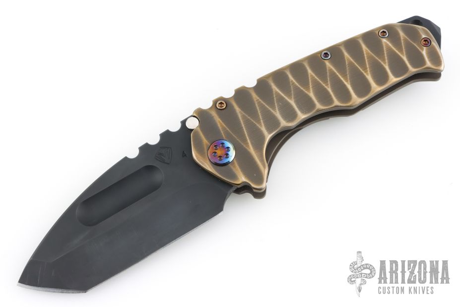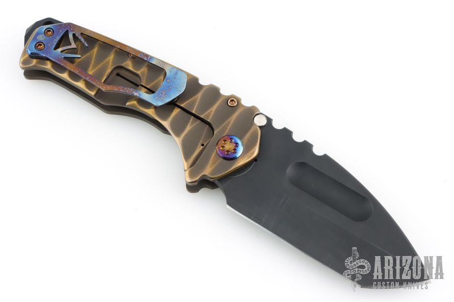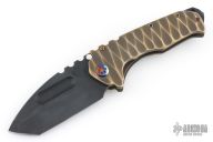 This Praetorian Ti by Medford Knife and Tool features a black PVD tanto blade with fullers and notched thumbrest. The handle has an anodized and sculpted titanium frame over a black PVD steel backspacer/glass breaker. The anodized titanium pocket clip is positioned for right hand, tip up carry. Includes a zippered case. Has a couple light scuffs, otherwise excellent condition.