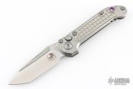 Microtech LUDT side-opening knife. Frag pattern stonewash finished Titanium handle with Tanto edge stonewash M390 plain steel blade.