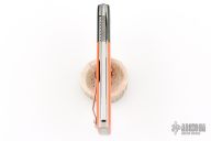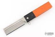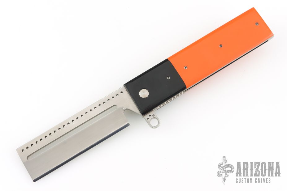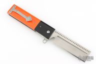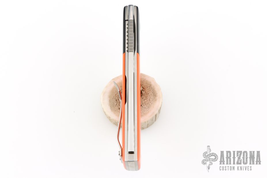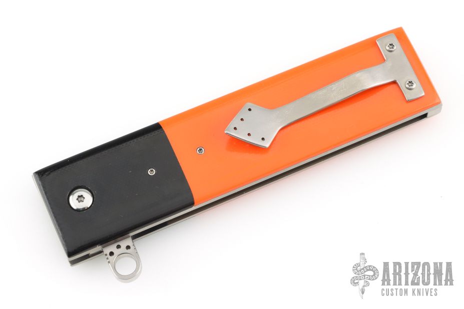 This knife by Jim Smyth features a mirror polished blade with a milled slot, notched thumbrest and flipper. The handle has black g10 dovetail bolsters with orange g10 covers, and satin titanium liners and backspacer. Satin finished tip up clip. Excellent condition.