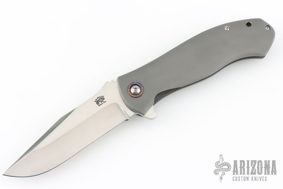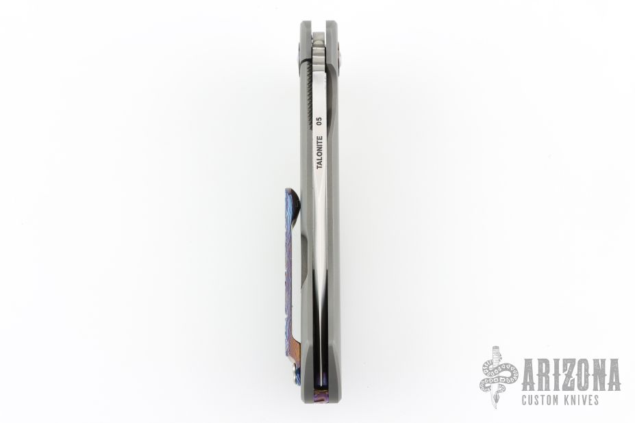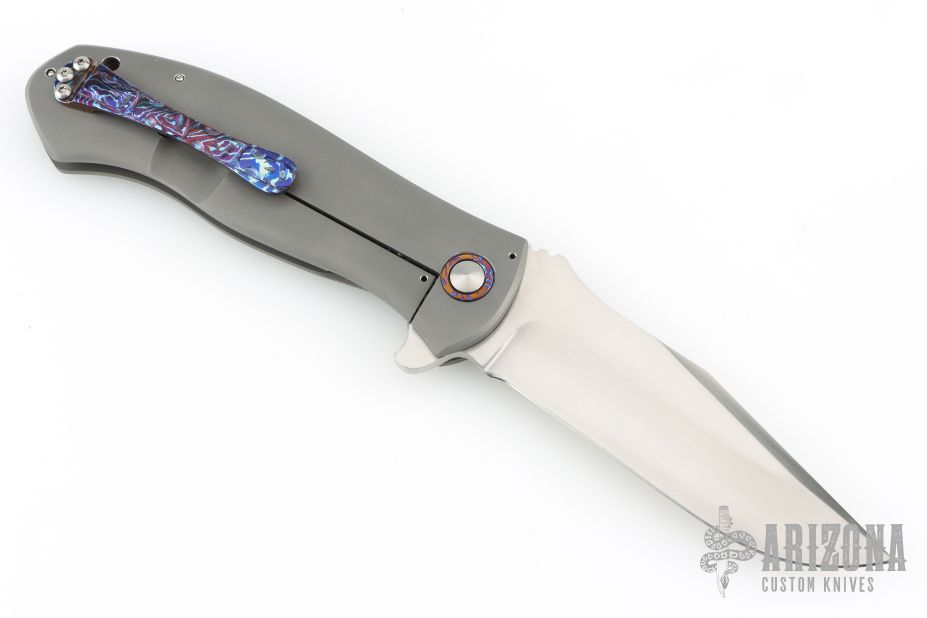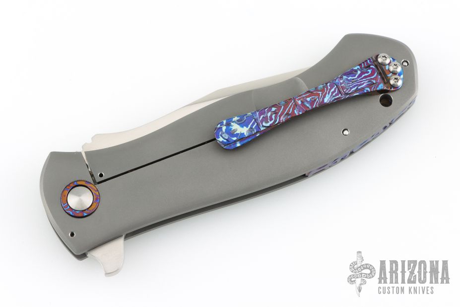 This linerlock flipper by DB Fraley features a hand-rubbed satin finished blade with a notched thumb ramp and a flipper.  The handle has a bead blast finished titanium frame, with Timascus collars, Timascus backstrap and Titanium tip up clip, both adorned with the "lost souls" carvings. Rides on teflon washers, nice detent, lockup and blade seating. Excellent condition. Comes with COA.