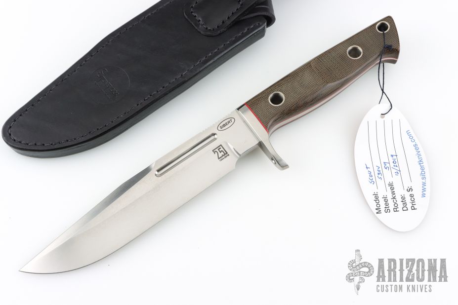 This Scout Bowie from Shane Sibert features a hand rub satin finished clip point blade with false top edge, fullers and notched thumbrest. .252" blade stock and 1.423" blade depth, tapered tang construction. The handle is comprised of a satin finished stainless steel guard, green canvas micarta scales with red liners and hollow pins. Includes black leather sheath, COA, and leather belt sheath. Excellent condition.