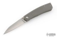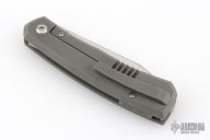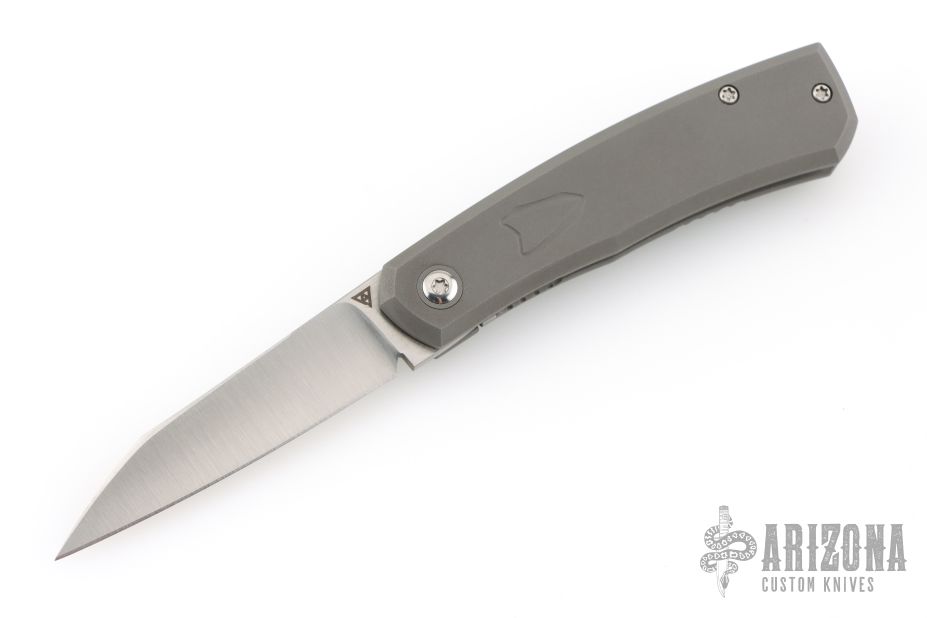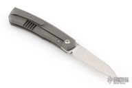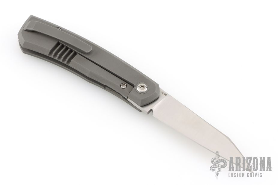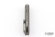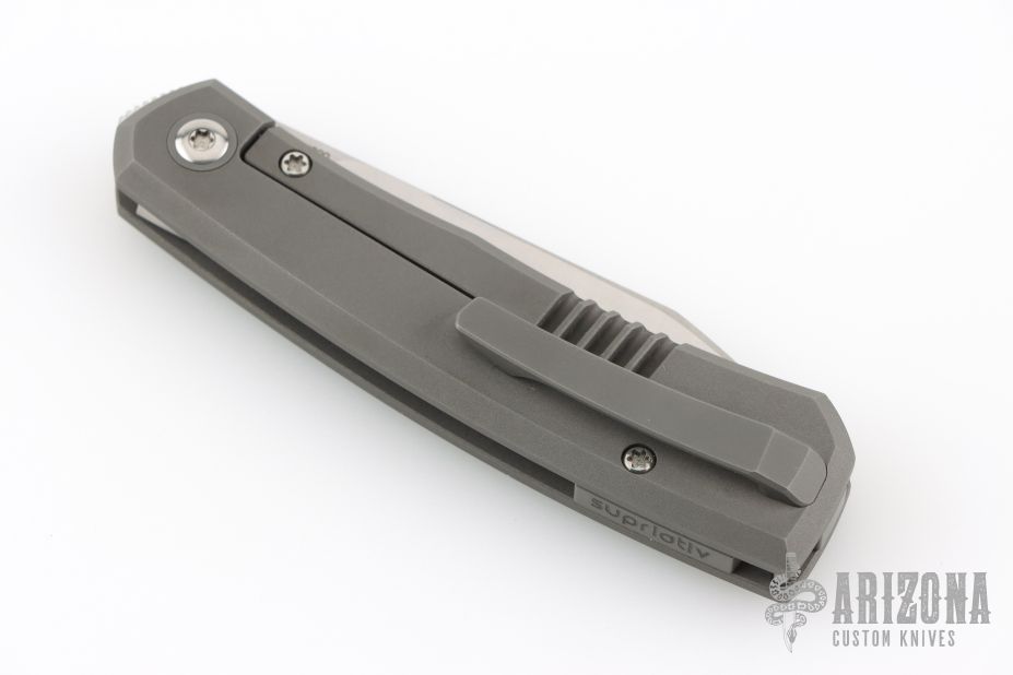 This Canibl by Suprlativ Knives features a hand rub satin finished blade with a notched front flipper. The handle has a dark bead blast finish titanium frame, titanium pivot collar, titanium backspacer with lanyard pin and tip up clip with hidden screws. Rides on bearings, nice detent, lockup and blade seating. Has stainless lockface insert. Comes with original box. Excellent condition.