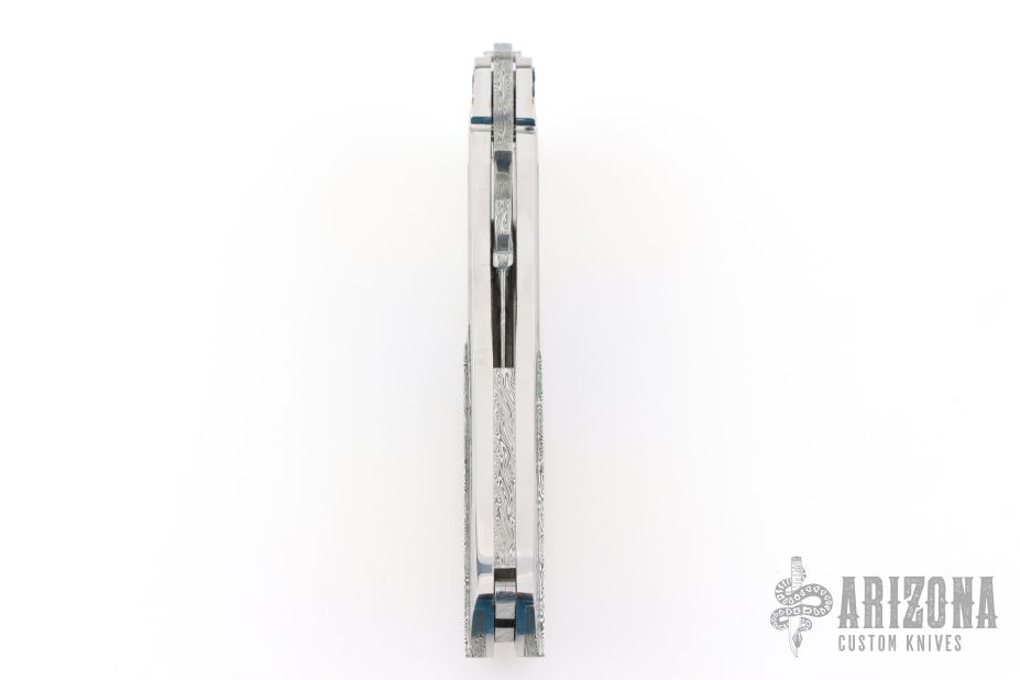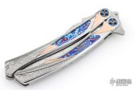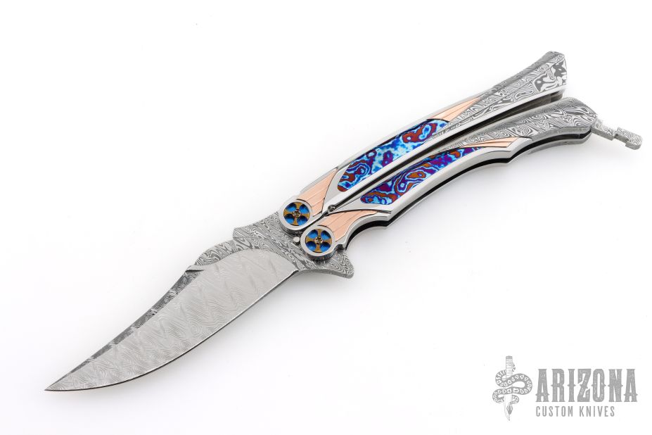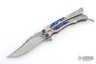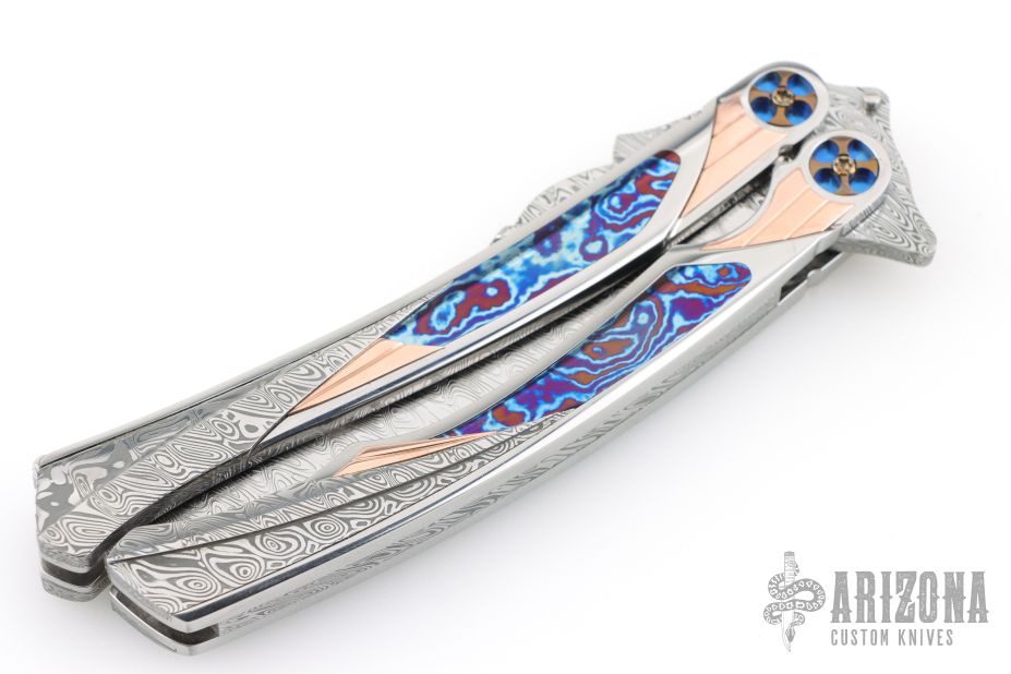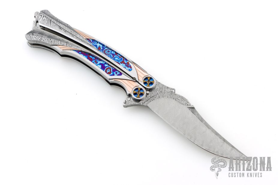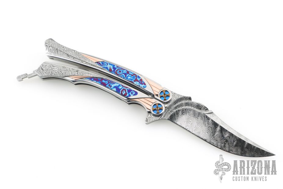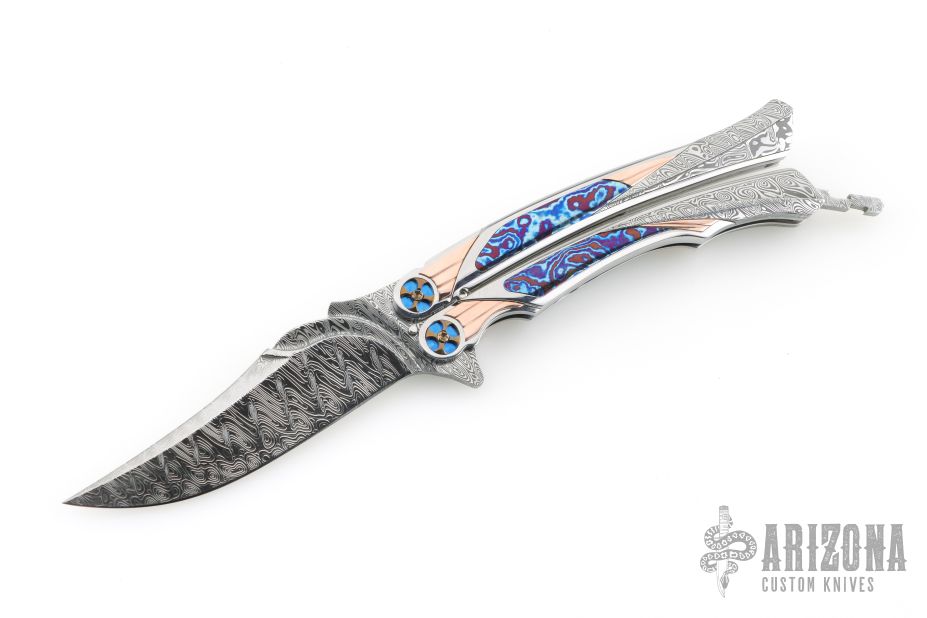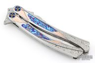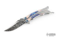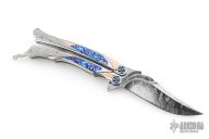 This Custom Order One Off Balisong by Ron Best features a polished Damasteel blade with carved ricasso and false top edge. The handles are polished stainless steel with fluted rose gold inlays, timascus inlays, and Damasteel inlaid rear bolsters, custom two-tone pivots, Damasteel spacers and latch. Rides on bearings, very smooth. Dated 2-2-25 inside the backspacer. Comes with original hard case. Excellent condition. Stunning!