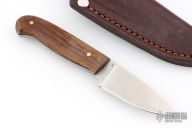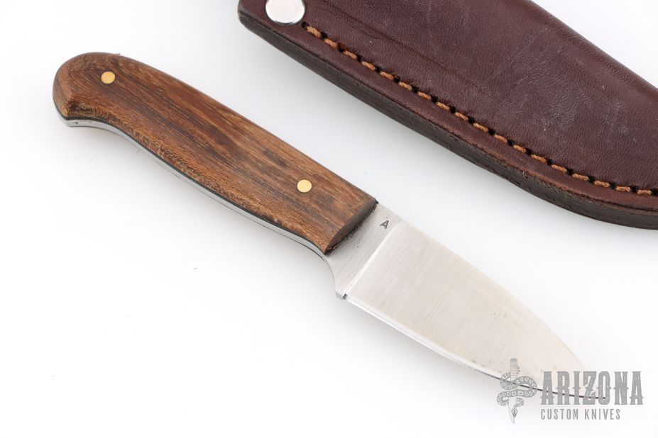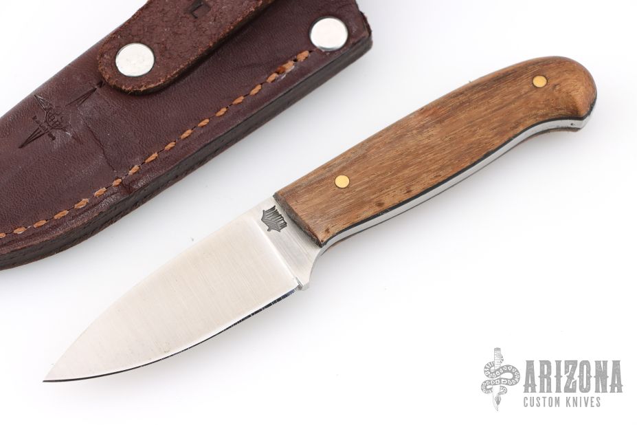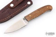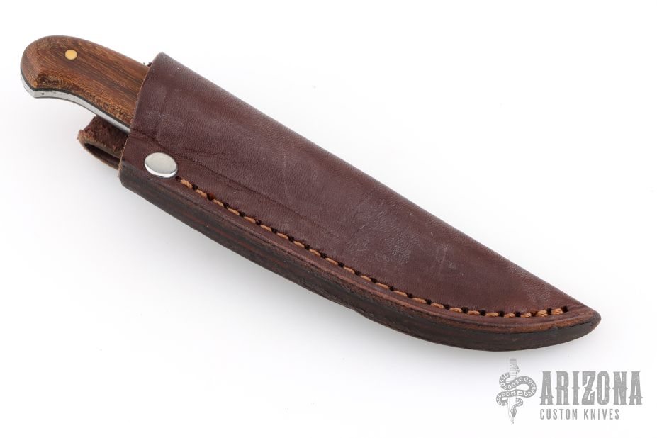 This knife by LT Wright features a satin finished blade with .12" blade stock and .90" blade depth, full tang construction. The handle has wood covers, black liners, and brass pins. Comes with a brown leather sheath. Excellent condition.
