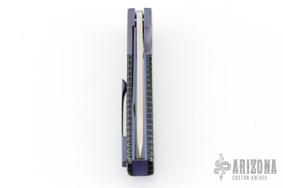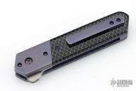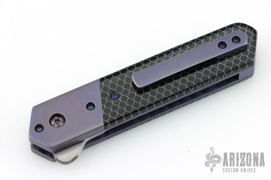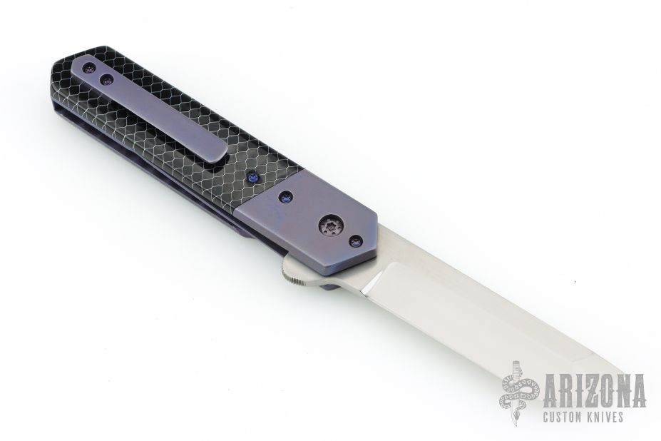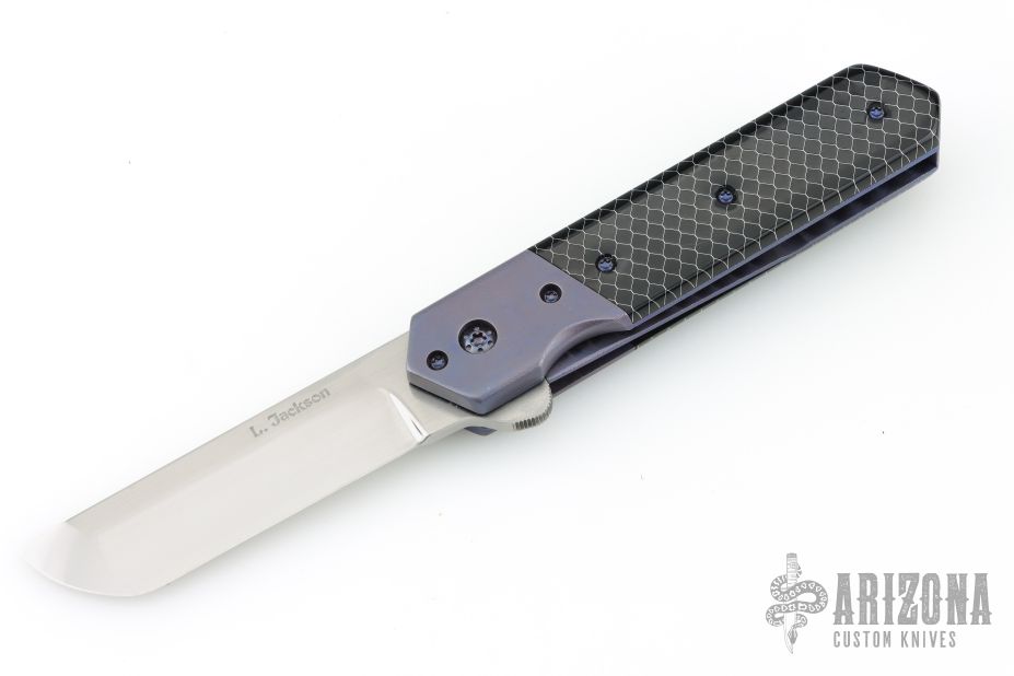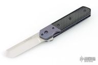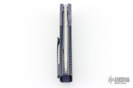 This Kwaiken Linerlock Flipper by Laramie Jackson features a hand rub satin finished blade with notched flipper. The handle has anodized titanium bolsters and tip up clip, black C-Tek scales, anodized titanium liners and backspacer. Rides on bearings, nice detent, lockup and blade seating. Comes with a zippered case and COA. Lockup is pretty late, otherwise excellent condition.