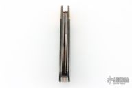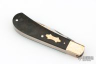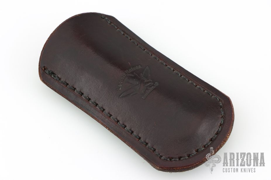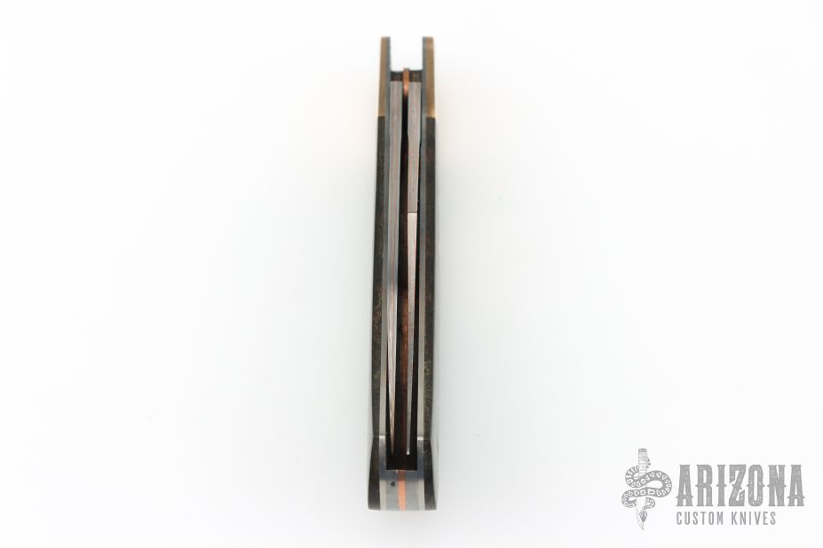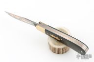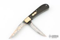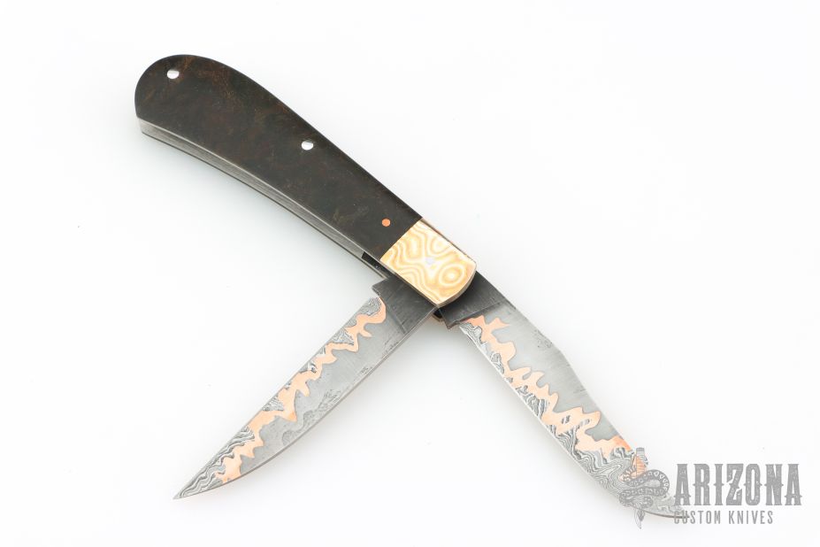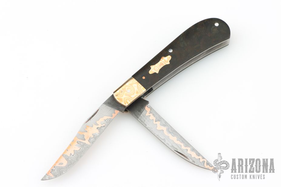 This Trapper by Jason LeClair features Damascus core CuMai Damascus blades with nail nicks. The handle has mokume bolsters and escutcheon, WWI rag micarta covers, titanium liners, stainless steel springs, copper center liner. Has half-stops, flush in all positions. Comes with a leather slip sheath.