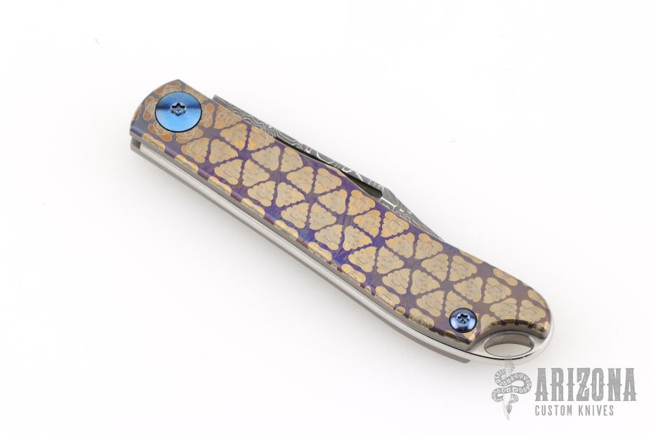 Poop Emoji Pattern D Rocket Design has created a custom run of a Lanny's Clip Slipjoint with a Vegas Forge Damascus blade.  The body and hardware are Titanium with a Poop Emoji pattern on the handle.  The Slipjoint is clean, Zen and with that fit and finish you expect from a D Rocket Design.  Closed 2.9 in. - OAL 5 in.  This is D Rocket Modern interpretation of your grandfathers carry with the heirloom quality to pass down.  I will be adding my Logo on the handle in a deep 3D laser etch. Comes with a zippered case. Excellent Condition.