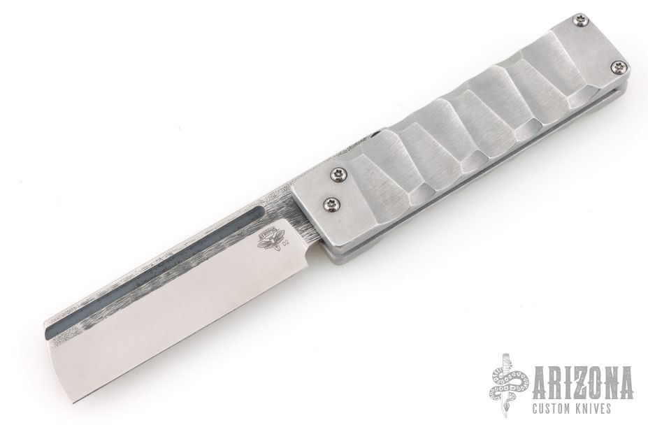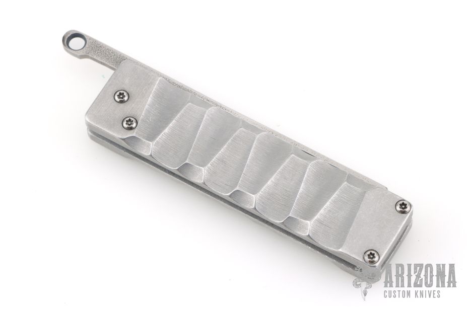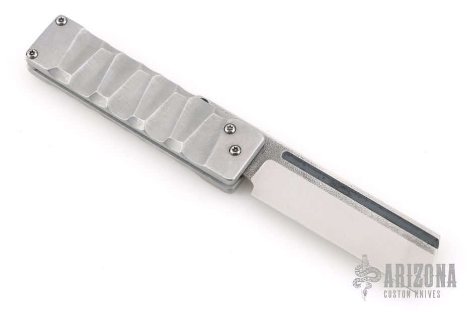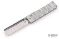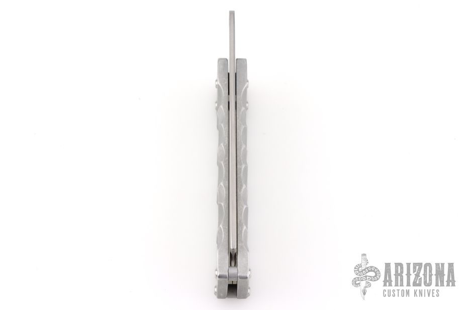 This Dr Zed Friction Folder by Atropos Knives features a satin finished blade with fullers and friction bar. The handle has textured aluminum scales. Comes with a zippered case. Excellent condition.