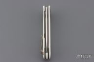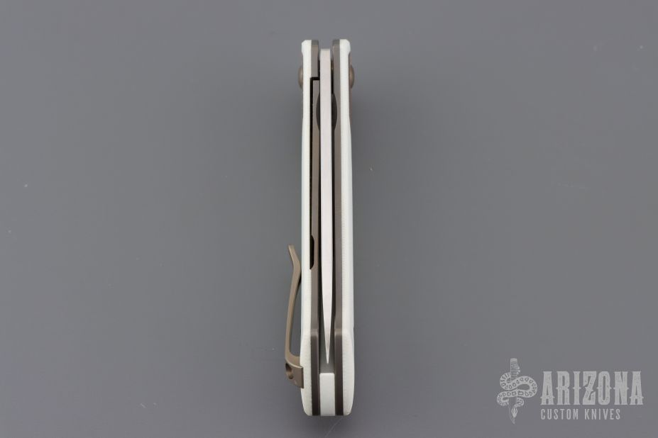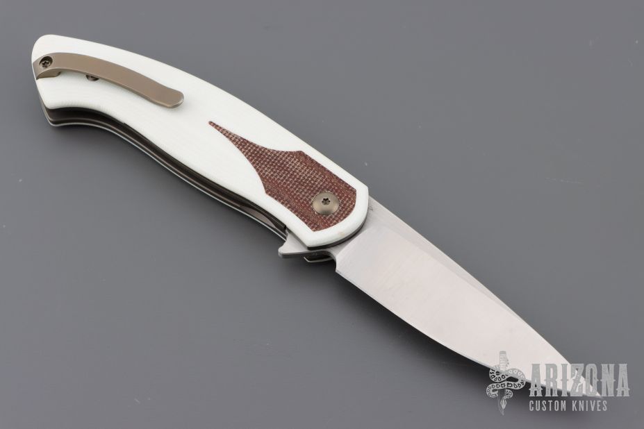 This Rodayo by Ohlone Knives features a satin finished blade with notched flipper. The handle has white G-10 scales with brown canvas micarta inlaid bolsters, white G-10 backspacer, anodized titanium liners, clip and hardware. Rides on bearings, nice detent, lockup and blade seating. Comes with original box. Has a couple light scuffs, otherwise excellent condition. Very nicely constructed.