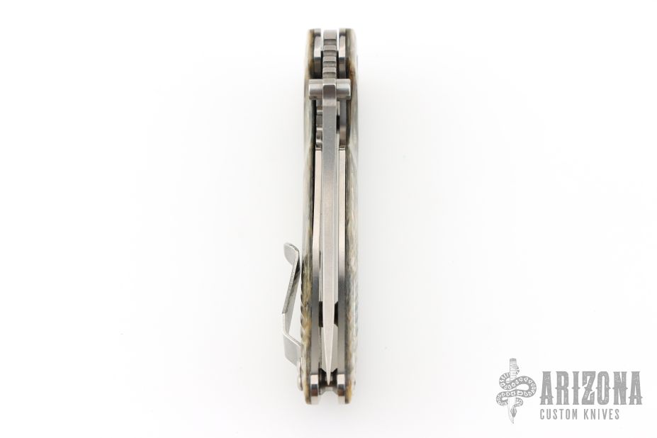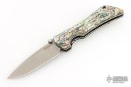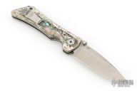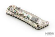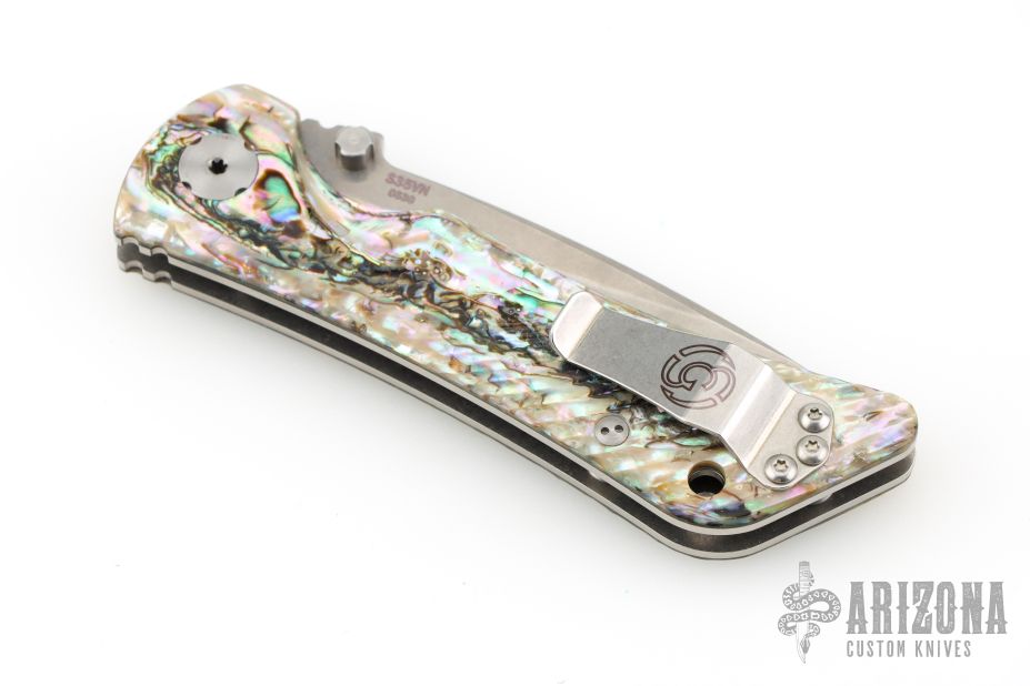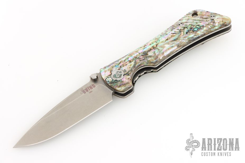 This Spider Monkey Linerlock folder by Southern Grind features a tumble finished drop point blade with dual thumbstuds and a notched thumbrest. Handle has abalone scales over titanium liners and barrel spacers, stainless steel tip up clip, and lanyard hole. Excellent condition.