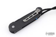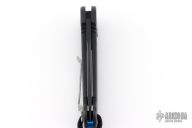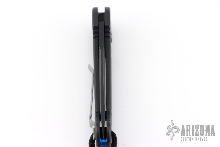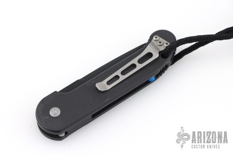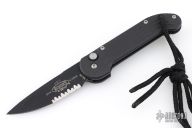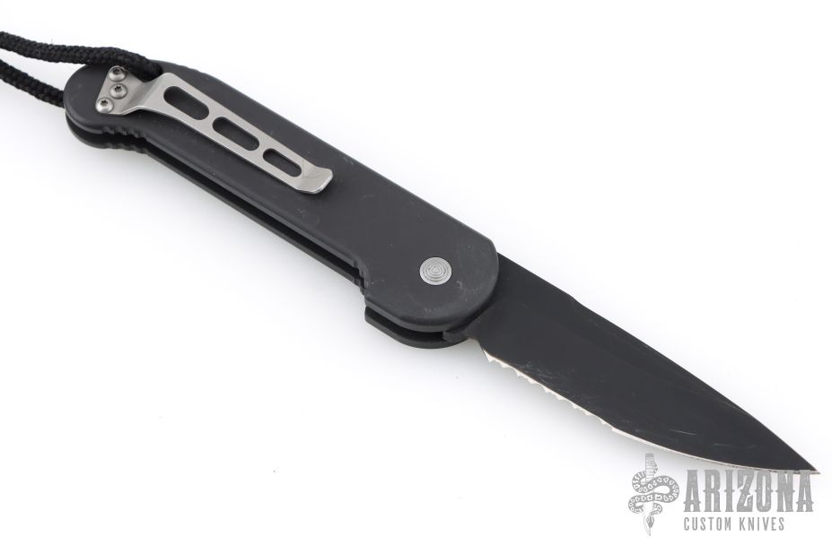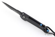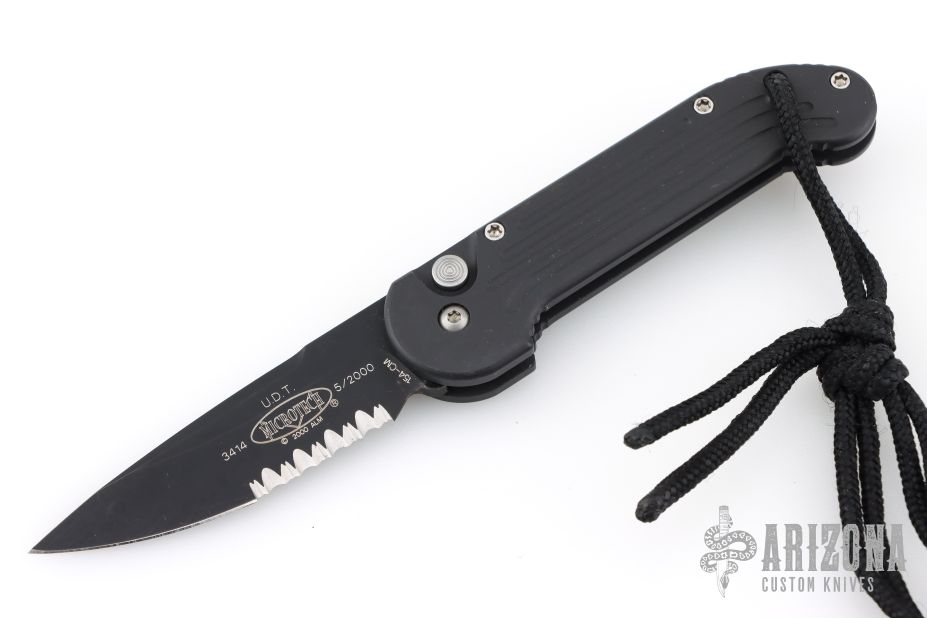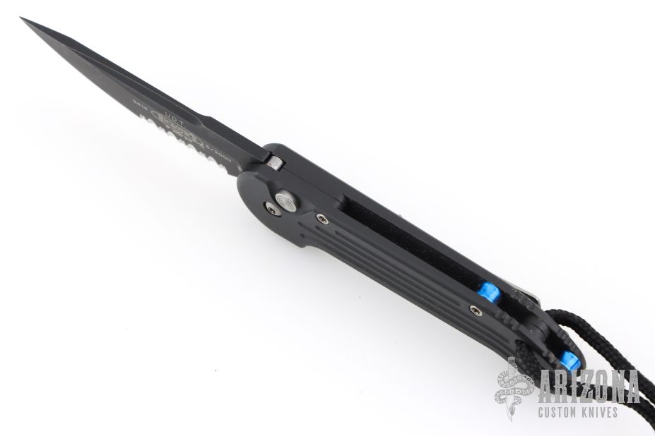 This UDT by Microtech has a black blade with partial serrations. Stainless steel clip, tip up carry. Blue posts. Black aluminum handle with lanyard hole and lanyard. Side opening coil-spring automatic. Has some scuffs and scratches, otherwise good condition. Hard to find.