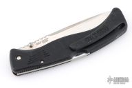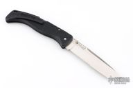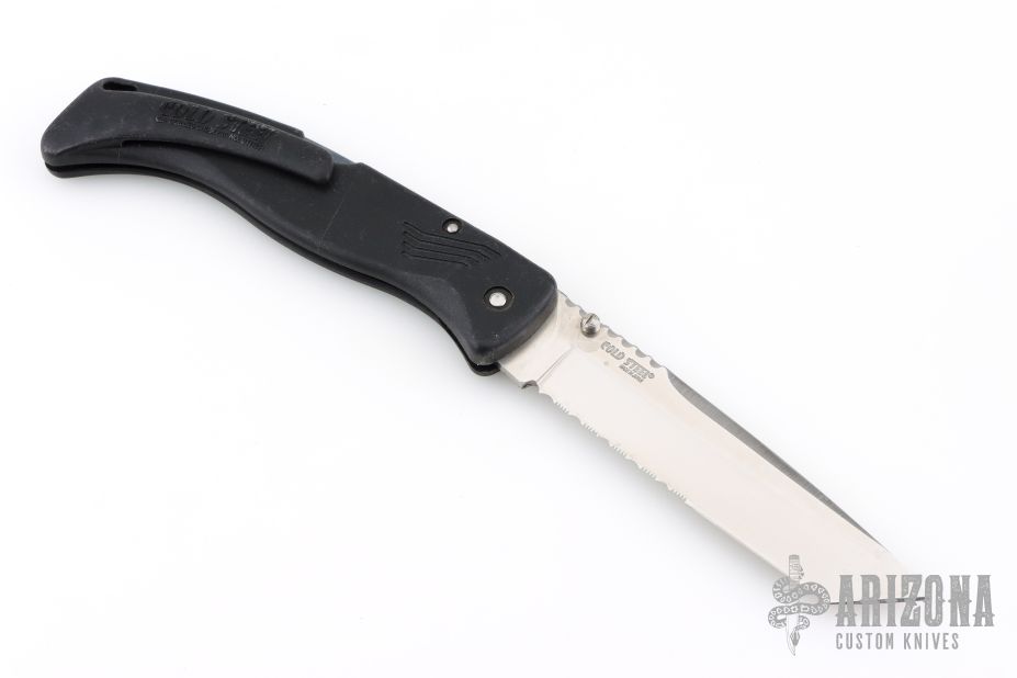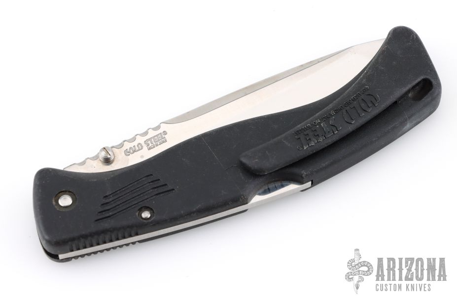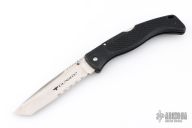 This Gunsite lockback folders by Cold Stel feature a partially serrated tanto blade with fileworked thumbrest and dual thumbstuds. The handle has black composite frame with an integral clip. Nice lockup and blade seating. Has some scratches, otherwise good condition.