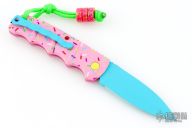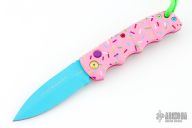 Have you ever been unfortunate enough to have to share a donut? Your plight only gets worse when you find you have to cover your high-speed, low-drag, modified, custom, mirror-edged piece of pocket jewelry in sticky sweetness. What you need is a knife designed from the ground up to go to war with a donut. And although its path to existence was unorthodox, the Dessert Warrior is here! This automatic will snap open before anyone can take more than their half of the donut. The handle is bright pink with sprinkles, and the blade has a candy blue finish, making the knife blend in with the pretty pastries of the shop. Gone are the days of not having the right tool for the job!