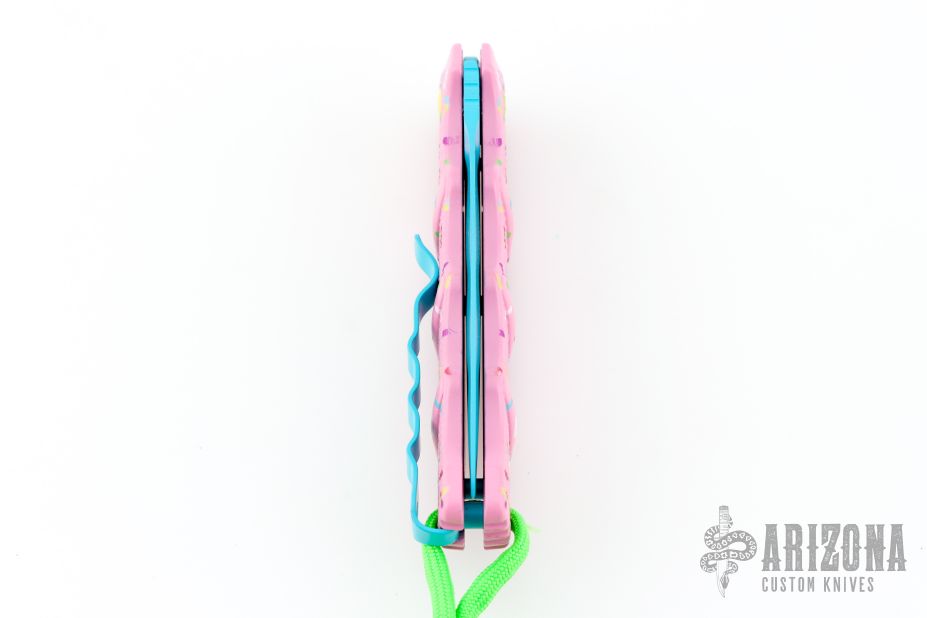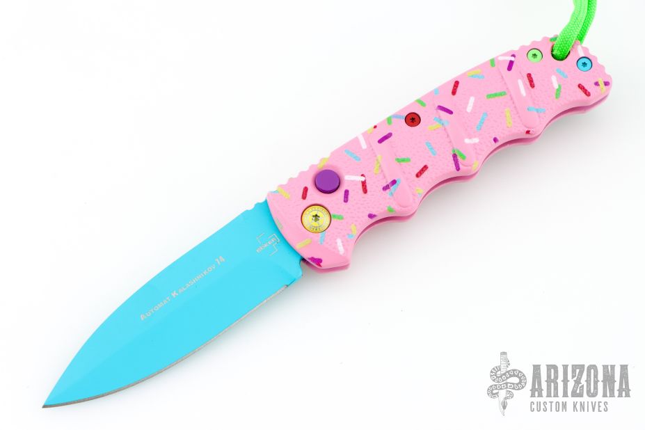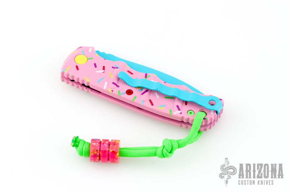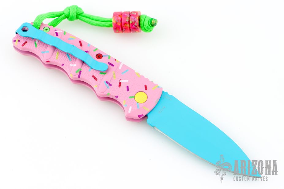 Have you ever been unfortunate enough to have to share a donut? Your plight only gets worse when you find you have to cover your high-speed, low-drag, modified, custom, mirror-edged piece of pocket jewelry in sticky sweetness. What you need is a knife designed from the ground up to go to war with a donut. And although its path to existence was unorthodox, the Dessert Warrior is here! This automatic will snap open before anyone can take more than their half of the donut. The handle is bright pink with sprinkles, and the blade has a candy blue finish, making the knife blend in with the pretty pastries of the shop. Gone are the days of not having the right tool for the job!