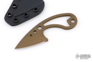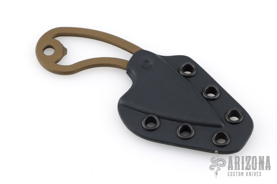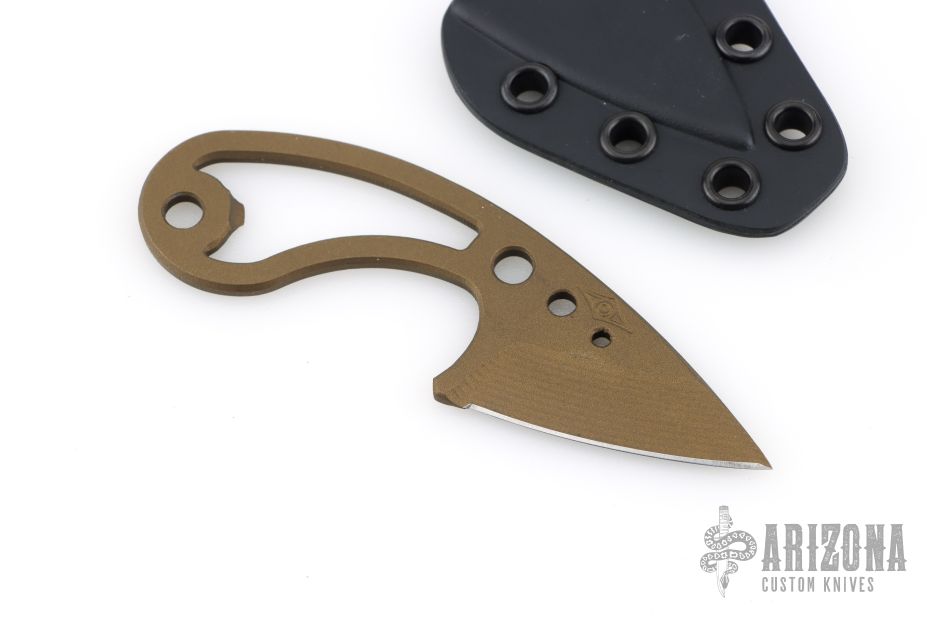 This Origin Knife by RMJ Tactical features a bronze coated blade and handle with bottle opener and lanyard hole in the butt, .135" blade stock and 1.336" blade depth. Comes with a kydex neck sheath. Has a couple light scuffs, otherwise excellent condition.