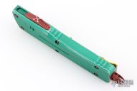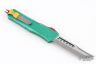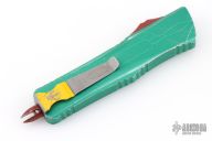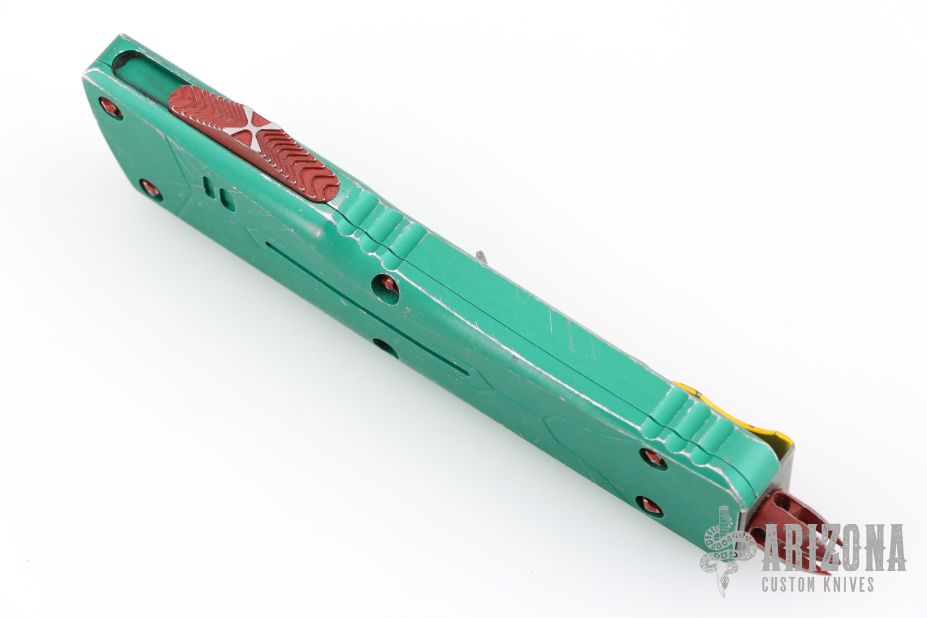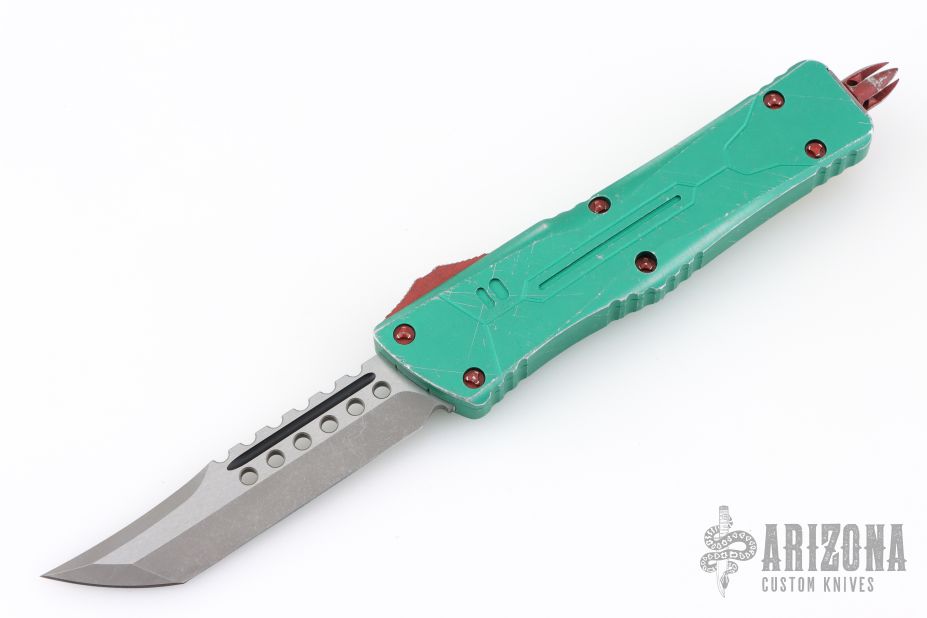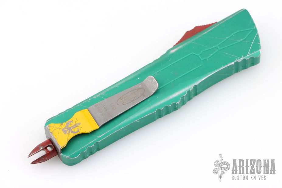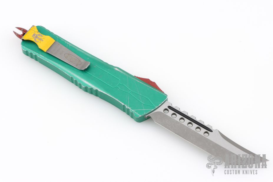 This Combat Troodon Bounty Hunter by Microtech Knives features a Hellhound tanto blade with fullers, satin flats and apocalyptic finished grinds. The handle has a green battle worn aluminum handle with red hardware, tip down apocalyptic finished stainless steel clip. Excellent condition. Dated 10/2017 s/n 0208.