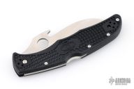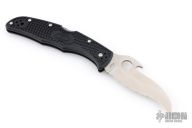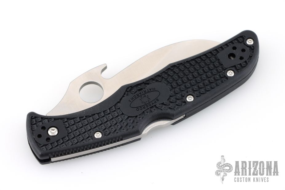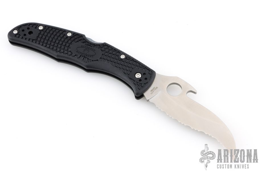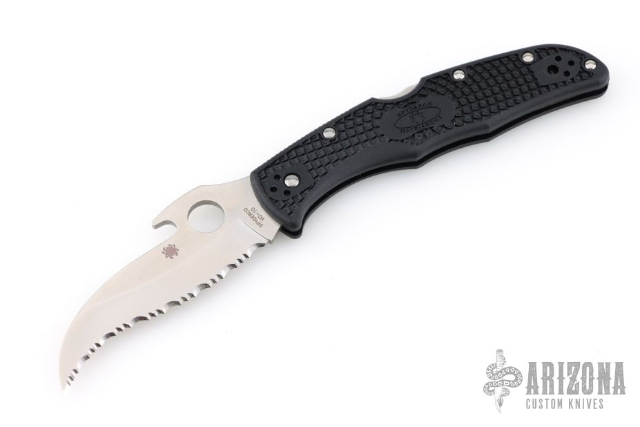 This Matriarch from Spyderco features a satin finished full serrated hawkbill blade with thumbhole and wave features. The handle is black FRN. The clip is missing, otherwise excellent condition.