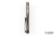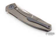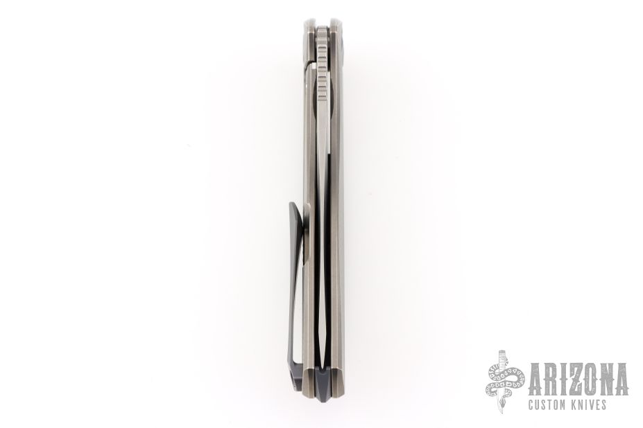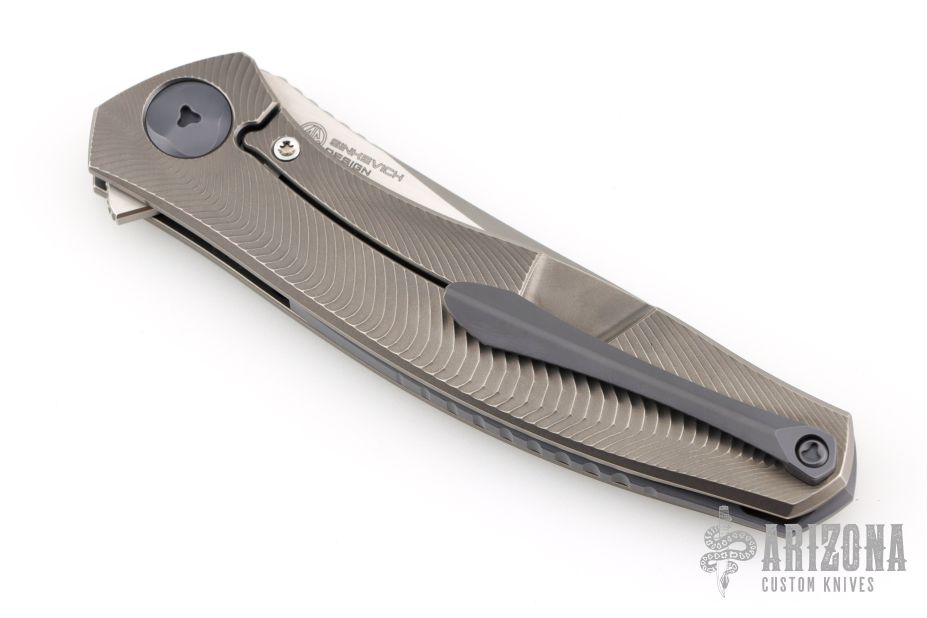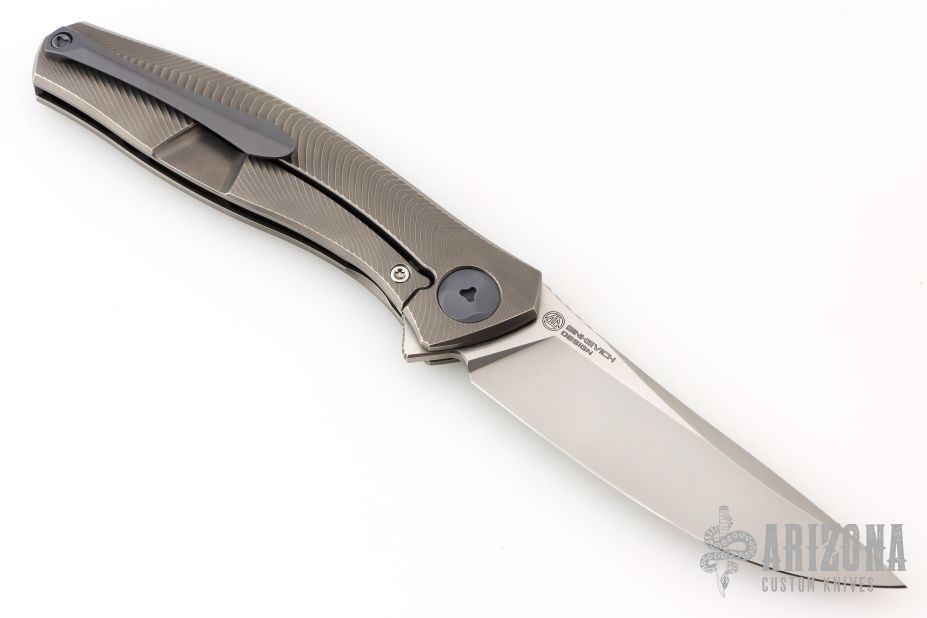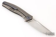 This knife by Shirogorov Knives features a tumbled blade with satin flats and a notched thumb rest and flipper tab.  The handle features a milled titanium frame with a blasted zirconium tip up pocket clip and backspacer.  Blade Steel: M398.  S/N 007/300.  Includes the original box and COA. Excellent condition.