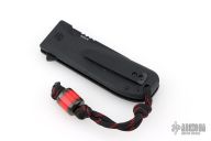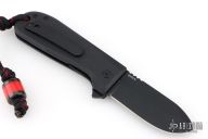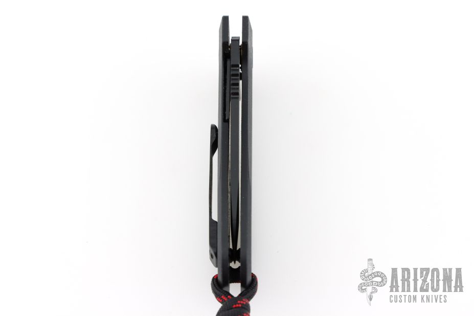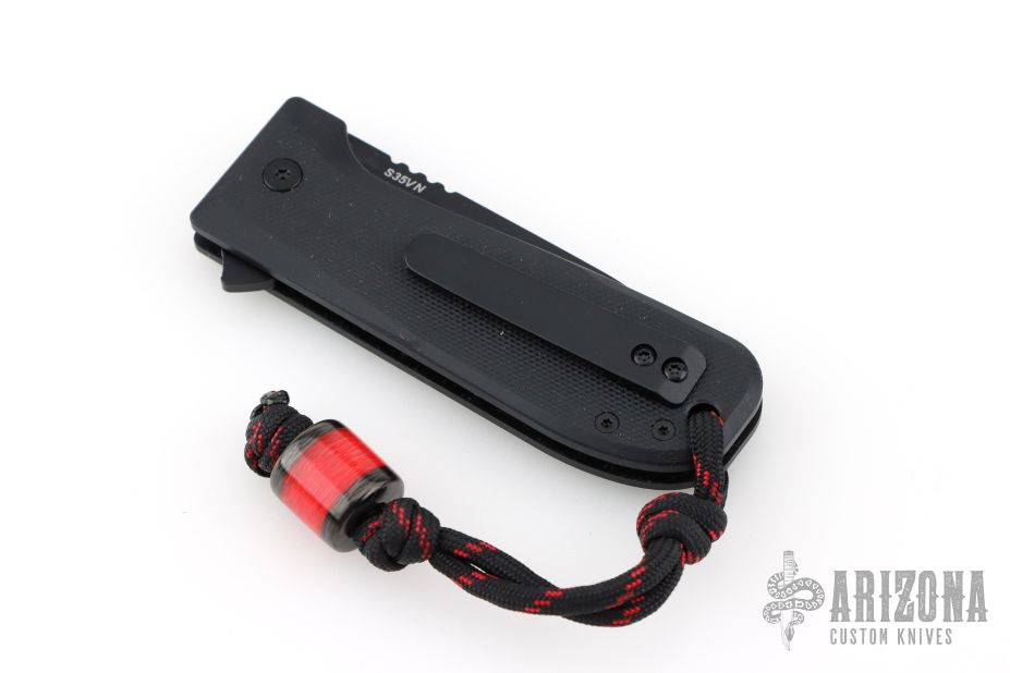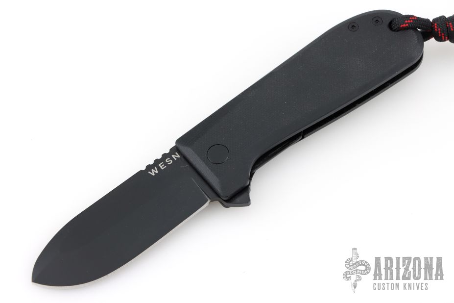 This knife by WESN features a black drop point blade with flipper tab and notched thumb rest. The handle has black g10 covers, liners, standoffs, and tip up clip. Has a lanyard and lanyard bead. Great overall condition.