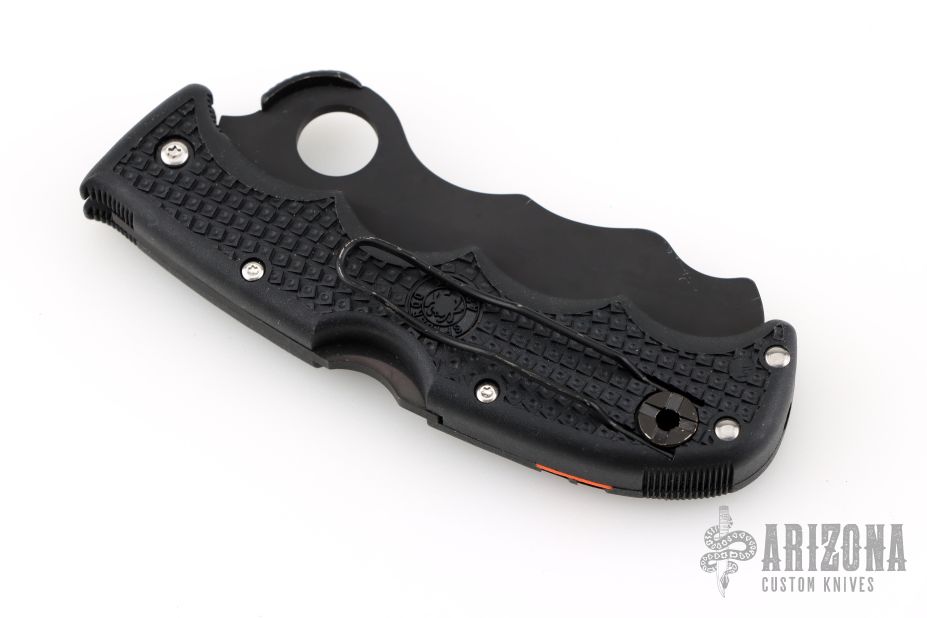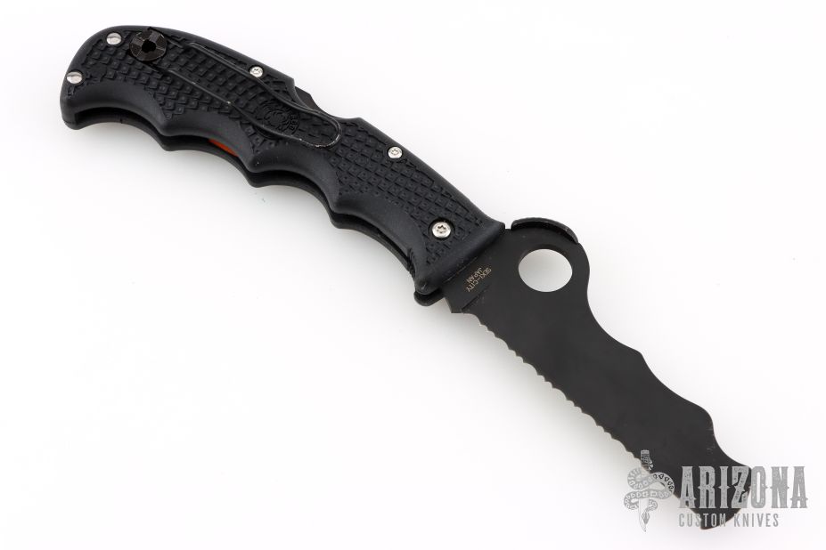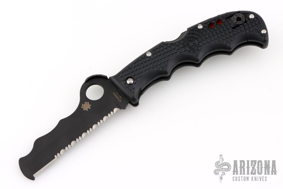 The Spyderco Assist was designed specifically with emergency, fire and rescue professionals who rely on their knives to function flawlessly under pressure. The Assist from Spyderco features a blunt-tipped VG-1 stainless steel blade with an 80% serrated edge for cutting seatbelts and fibrous material. Above the round thumb hole, a Cobra Hood positions the thumb directly over the hole for quick blade deployment and doubles as a leveraging platform for the thumb. The wavy pattern cut from the top of the blade (created by a fireman from Sweden) and along the inside of the handle let you place a piece of rope (between the half-open blade and handle) and scissor the blade shut- especially convenient for cutting rope in-and-around flesh without having to fully open/expose the knife's blade. The FRN handle is Bi-Directional textured and contours with bulges that ergonomically wrap around your palm. In the closed position, squeeze the blade deeper into the handle and a retractable carbide tip protrudes out from the base for breaking glass. If that weren't enough, the handle has a built-in survival whistle. Reversible tip-up wire clip for carry. Has some light scuffs, otherwise excellent condition.