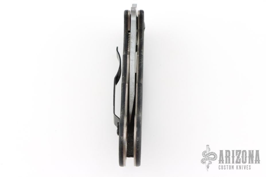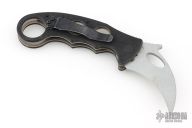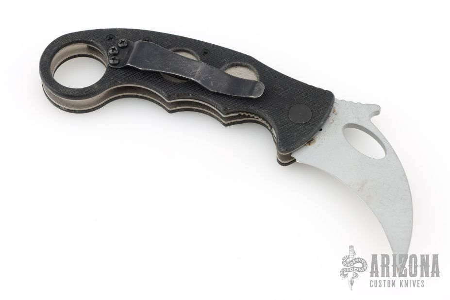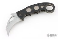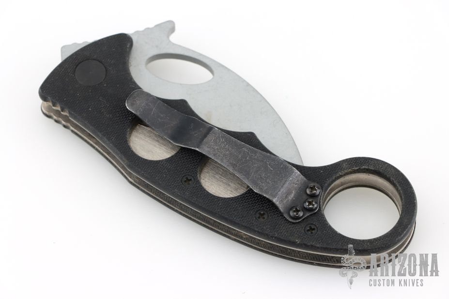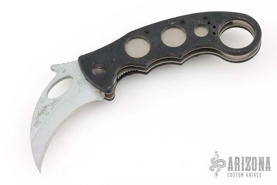 This Emerson Karambit has a silver finished chisel grind blade with notched thumbrest, thumbhole and wave feature. Handle is black G10 with titanium liners, and black tip up black stainless steel clip, left or right reversible. S/N 0884. Has some scuffs and scratches, otherwise good condition.