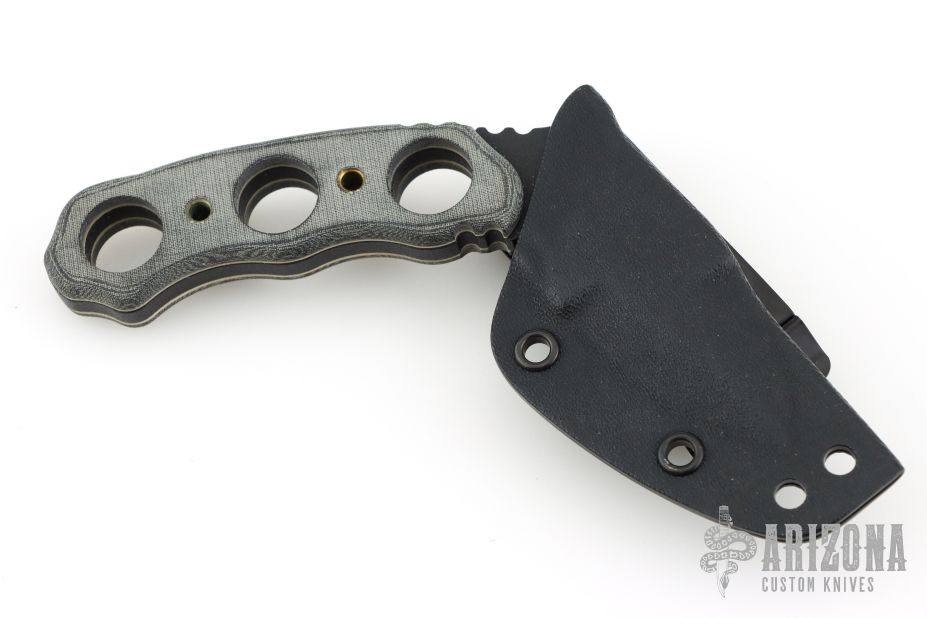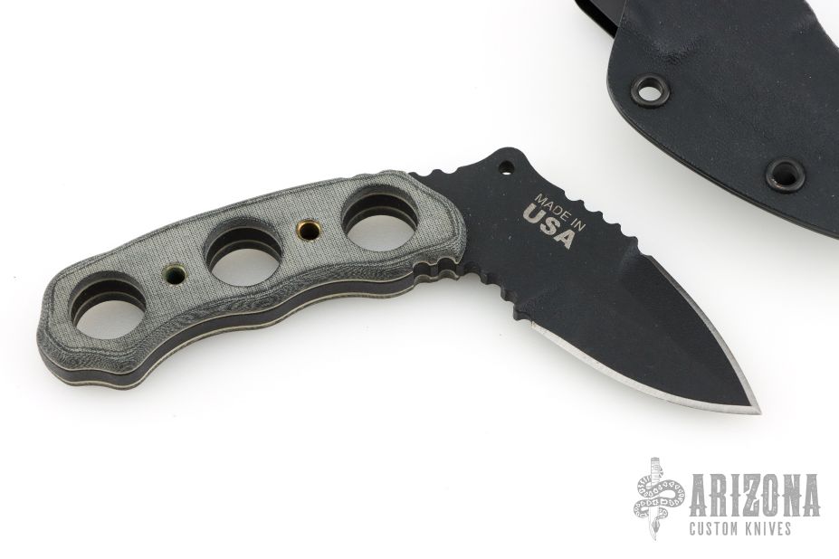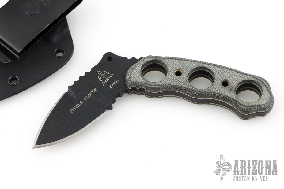 The Devil's Elbow XL is a unique knife that fits a niche market for those who need a small light-weight performance knife. Like TOPS says: this [knife] may look odd, but numerous training sessions have shown that in well trained hands... this is a great defensive tool... and may aid with weapon retention or as at a "last ditch stand." This knife is built strong, to last a life time and then some. Comes with Kydex sheath. Excellent condition.
