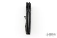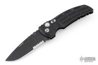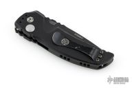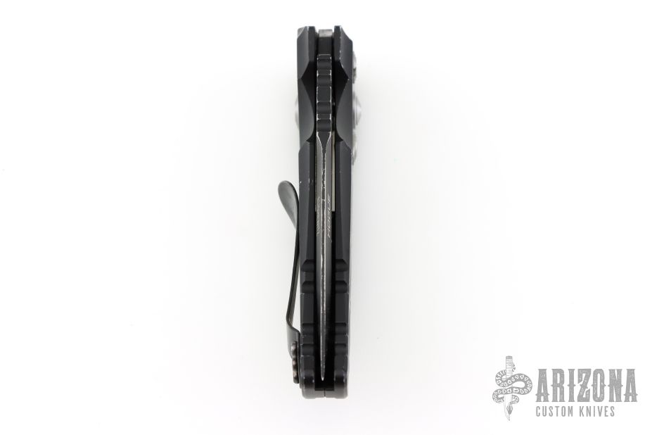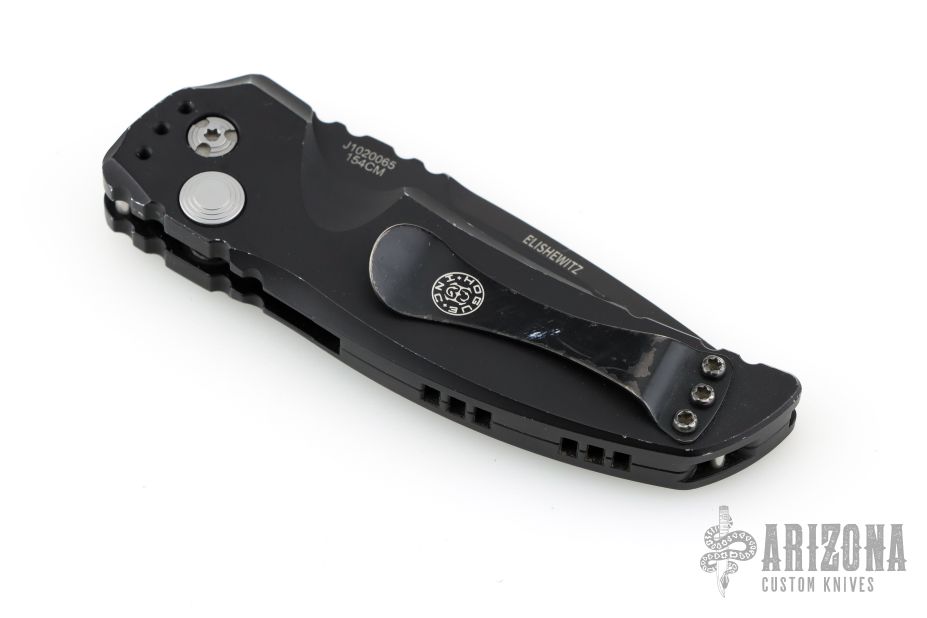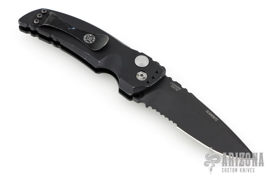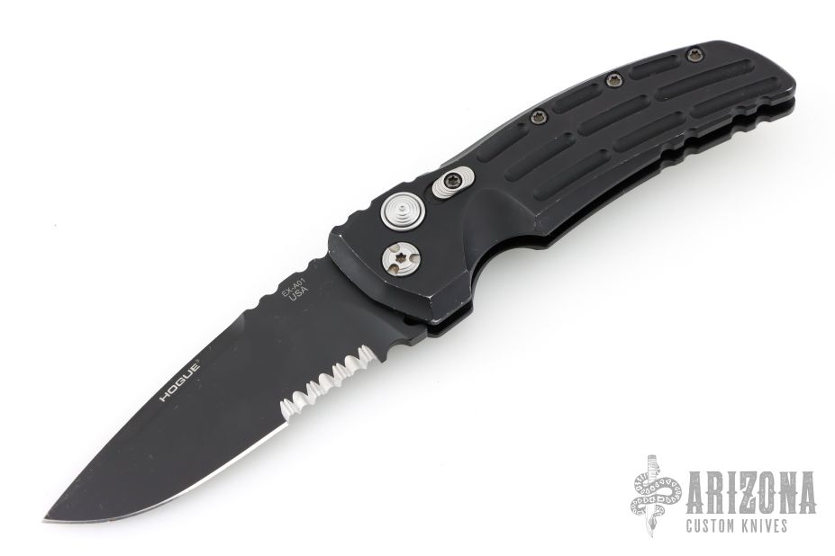 This EX-A01 by Hogue Knives is an Allen Elishewitz design, it features a black drop point partially serrated 154CM blade with notched thumbrest. The handle is black aluminum, tip up or down reversible black stainless steel clip. Has safety. Has some scuffs and scratches good condition otherwise.