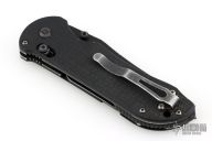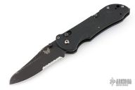 This Triage by Benchmade knives features a black coated serrated N680 steel blade with dual thumbstuds. The handle has milled and contoured g10 and black stainless steel liners, a carbide glass breaker at butt, and black finished stainless steel tip up clip. There is also a folding strap cutter/hook at the base of the knife. Comes with BM drawstring pouch. Has some scuffs and scratches, great overall condition.