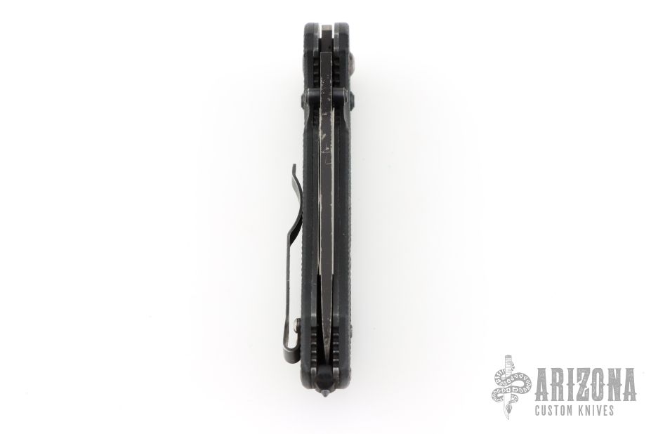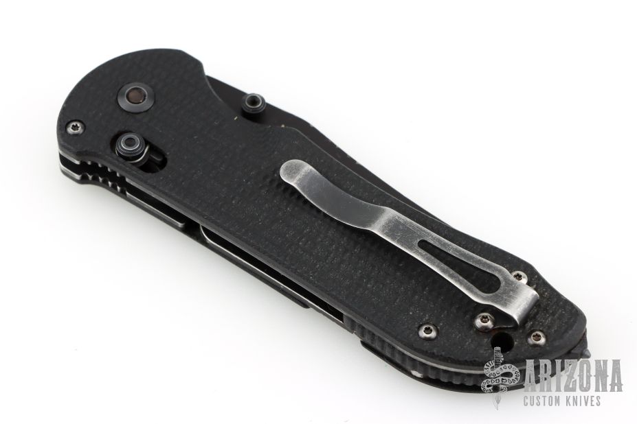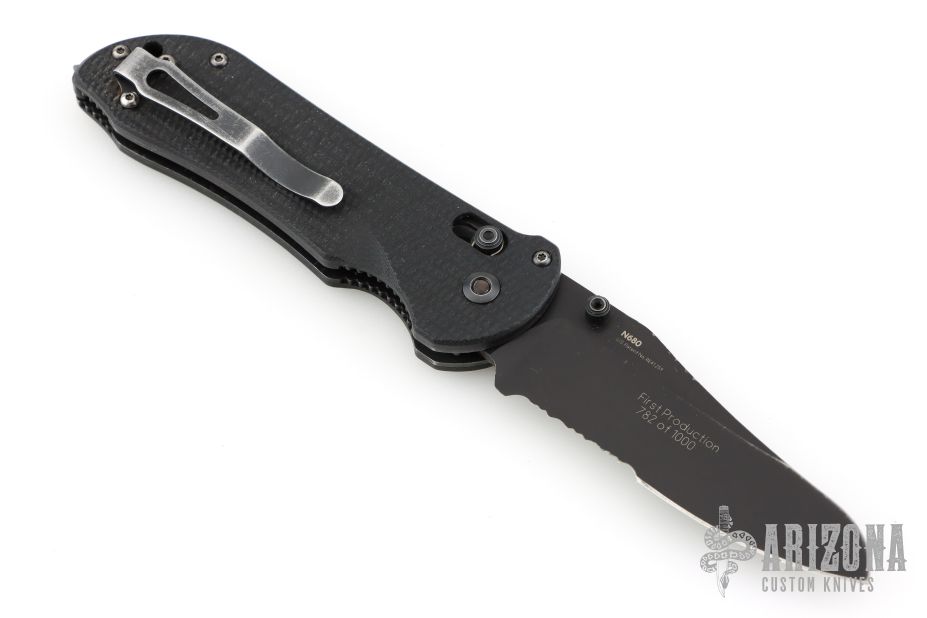 This Triage by Benchmade knives features a black coated serrated N680 steel blade with dual thumbstuds. The handle has milled and contoured g10 and black stainless steel liners, a carbide glass breaker at butt, and black finished stainless steel tip up clip. There is also a folding strap cutter/hook at the base of the knife. Comes with BM drawstring pouch. Has some scuffs and scratches, great overall condition.