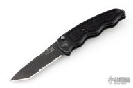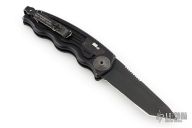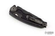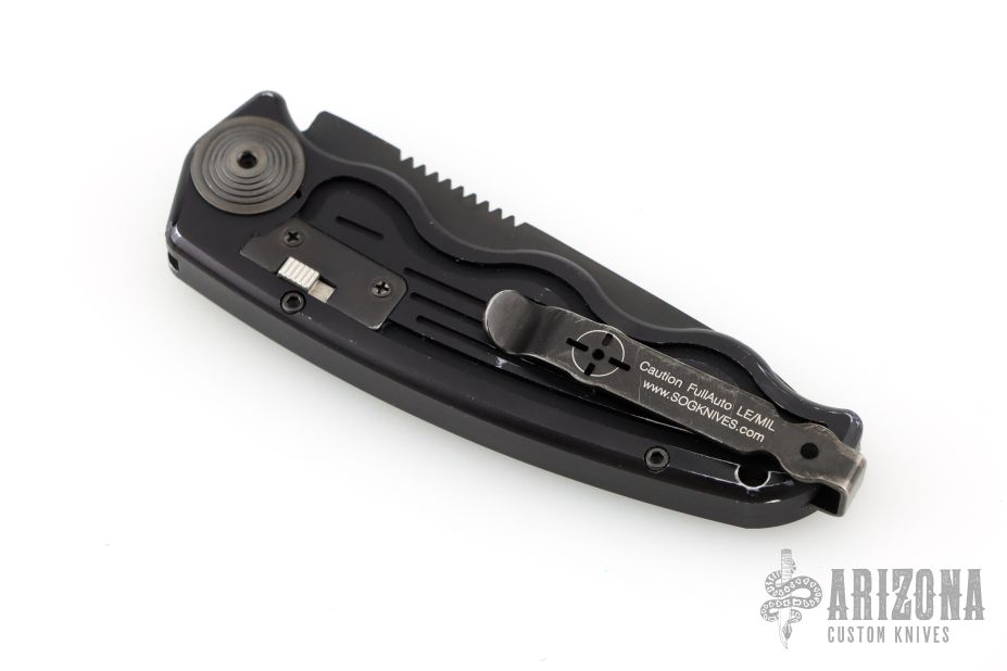 This SOG-TAC Auto Mini has a black finish tanto serrated blade with notched thumb rest. Handle is black anodized aluminum with safety, lanyard hole, and stainless steel tip up clip. Has scuffs and scratches, and some dings in the blade. Good overall condition.
