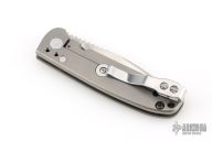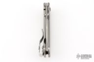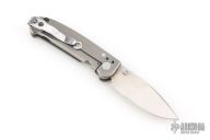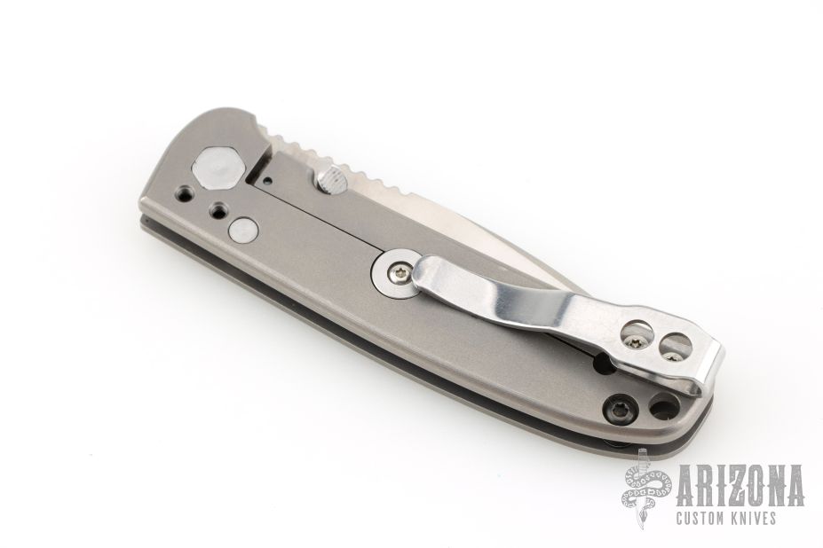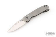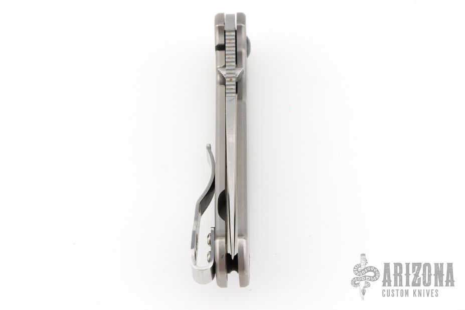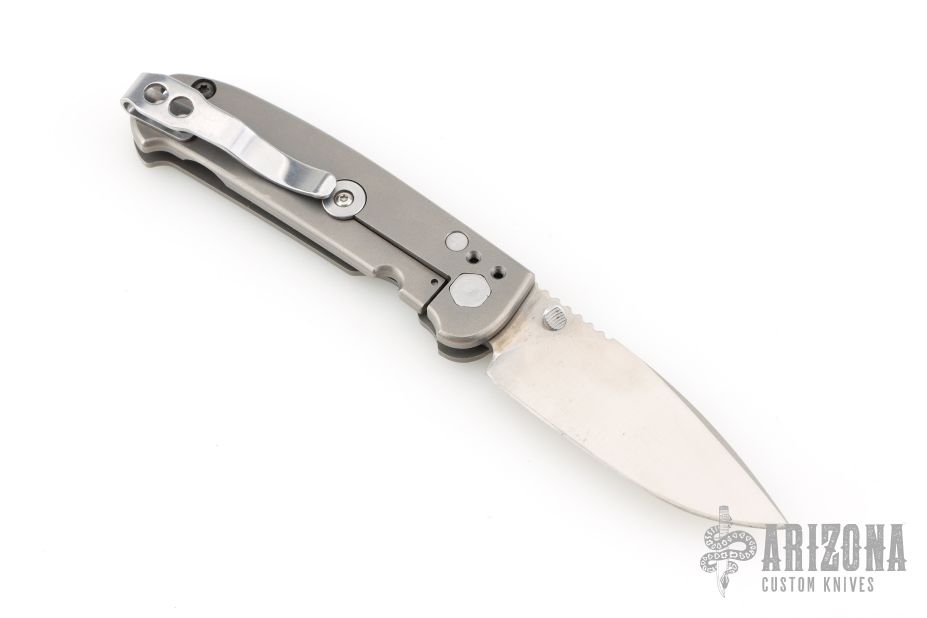 This framelock from A.G. Russell has a polished satin finished blade with dual thumbstuds. The handle has titanium covers, black posts, and stainless tip up clip. Has some light scuffs and scratches, great overall condition.