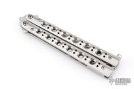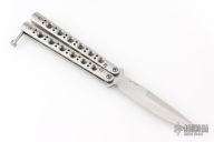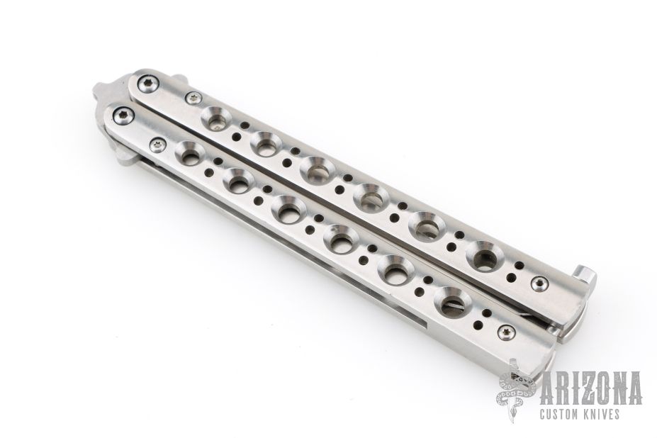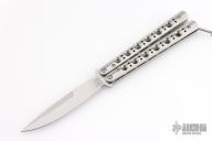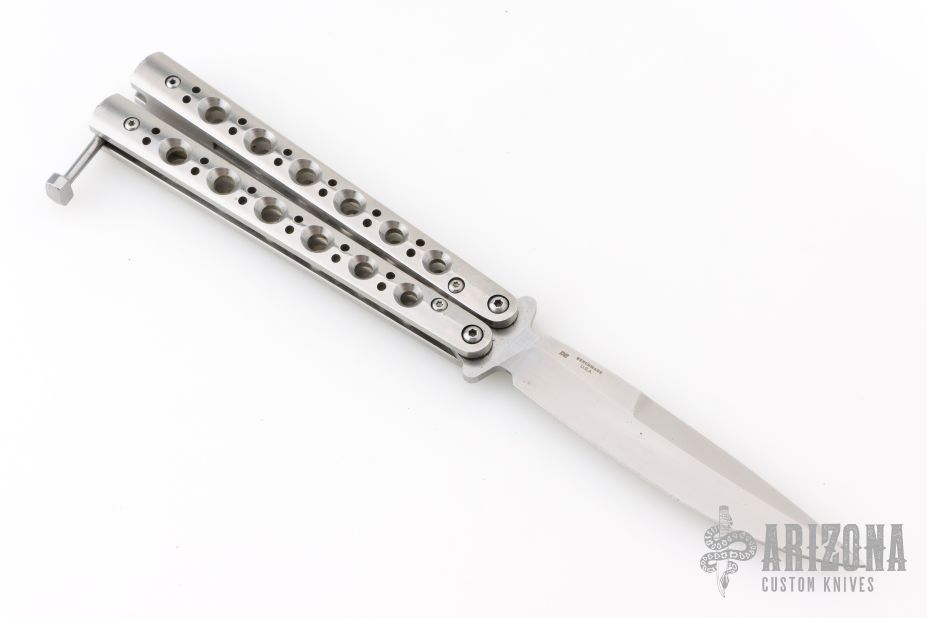 This Model 62 Balisong by Benchmade features a stonewashed spear point D2 blade with a false top edge. The handle has stainless steel handles and latch. Has scuffs and scratches, good condition otherwise.