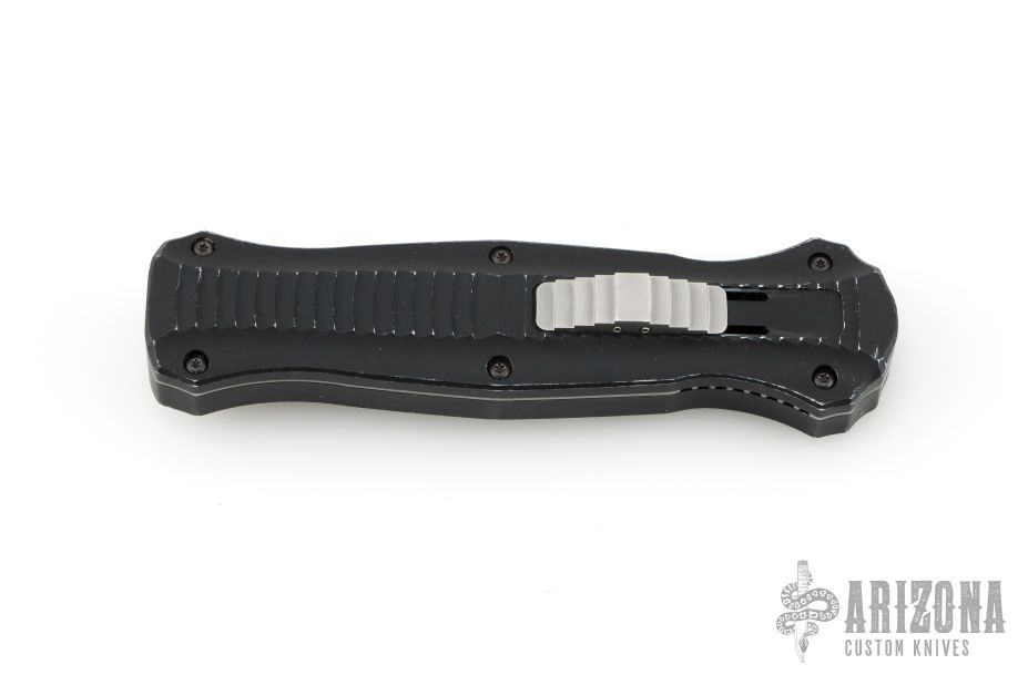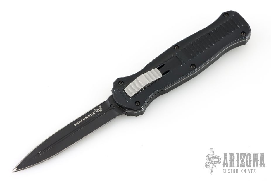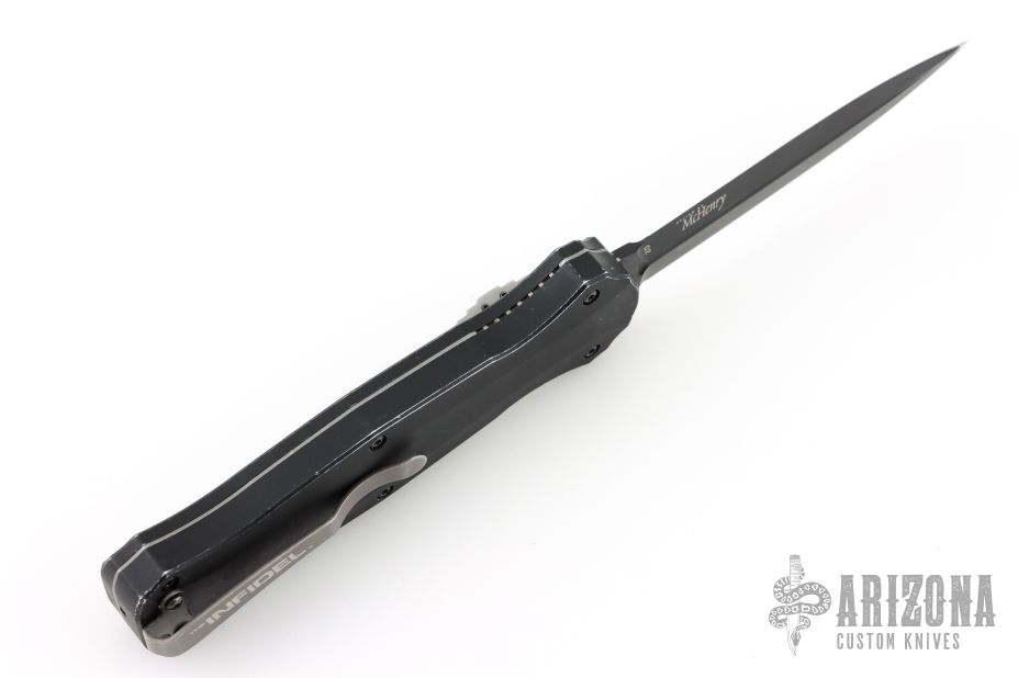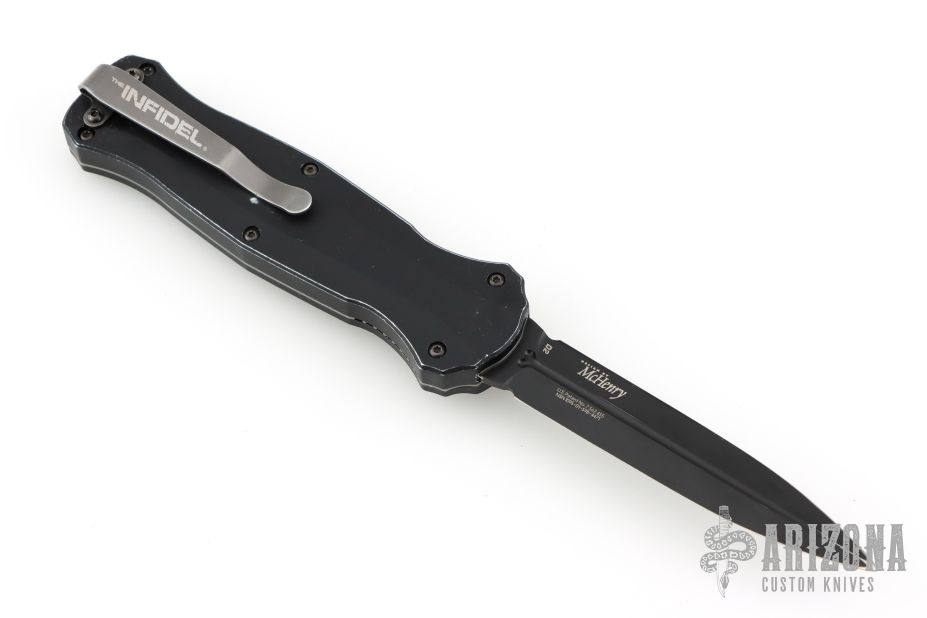 "Introducing an OTF like none-other.. The new Infidel® is rapidly making believers out of many a skeptic. Built for strength and reliability the patent pending double-action mechanics get it done over the long haul. Grab on and you will find the handle grip rock-solid with its patented machined in Presidio® style bi-directional tread pattern, and overall generous sizing for gloved hands. Intuitively pressure the release-slide forward and its spear-point edged steel fires and locks up with a unique three-point retention system with amazingly negligible blade play. Reverse the process and the blade retracts in a rapid blur of motion. The Benchmade Infidel is a special operator’s fantasy come true."