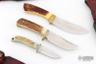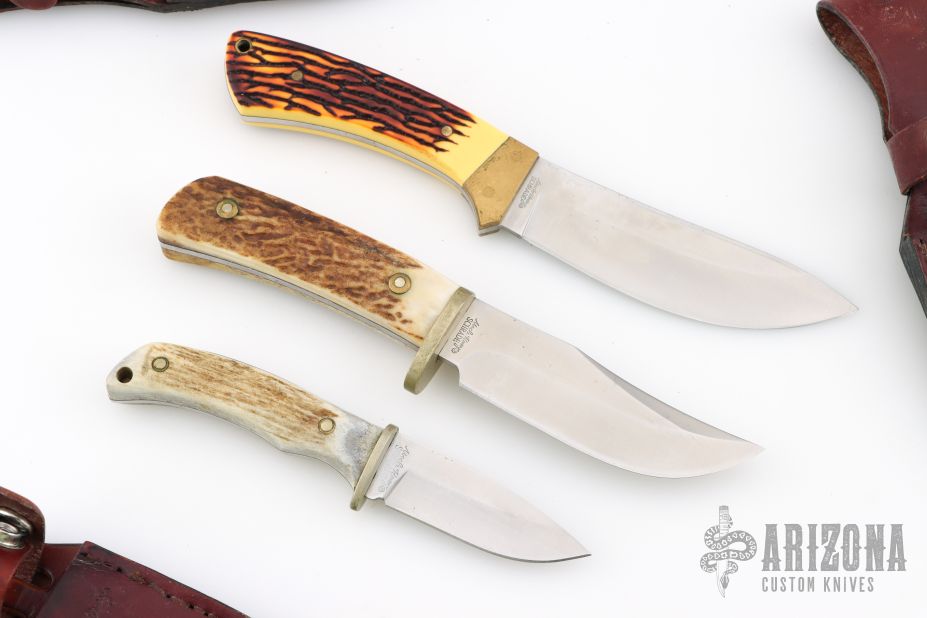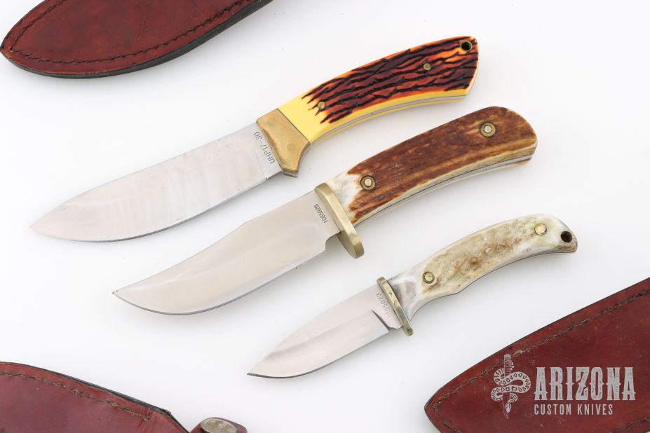 Schrade Uncle Henry 1085925. Has a satin finished blade, nickel silver guard and stag scales. Comes with a brown leather sheath. 4" blade and 8" overall