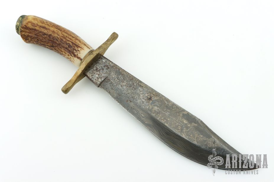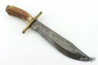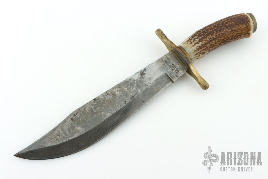 This Bowie by Marbles features a clip point Damascus blade with .185" blade stock and 1.916" blade depth, hidden tang construction. The handle has a brass guard, stag grip, brass spacer and butt cap. Has some oxidation, patina and scracthes, otherwise good condition. Could use some TLC.