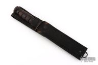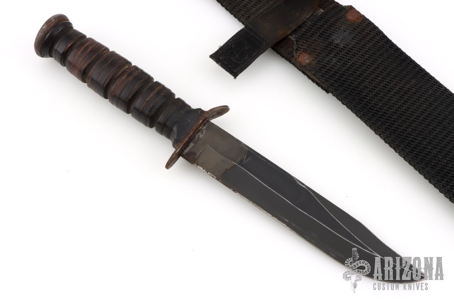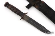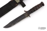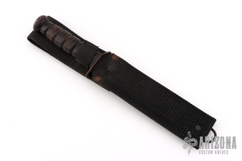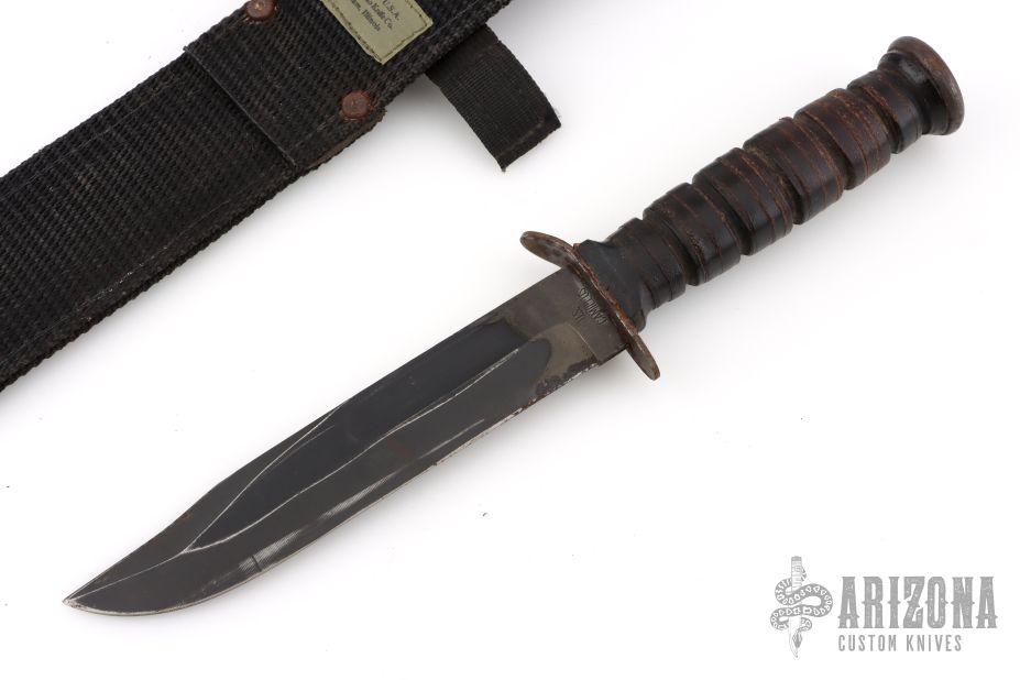 This USMC Fighter from Camillus Knives has been standard military issue since WW2.  Has a black blade with sharpened top edge, .161" blade stock and 1.048" blade depth, hidden tang construction. The handle has a steel guard and butt with stacked leather handle. Comes with black nylon EK sheath. Has some scuffs and patina, otherwise good condition for its age. built between Sept or Oct '74 and '89