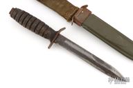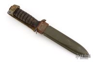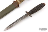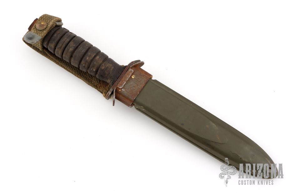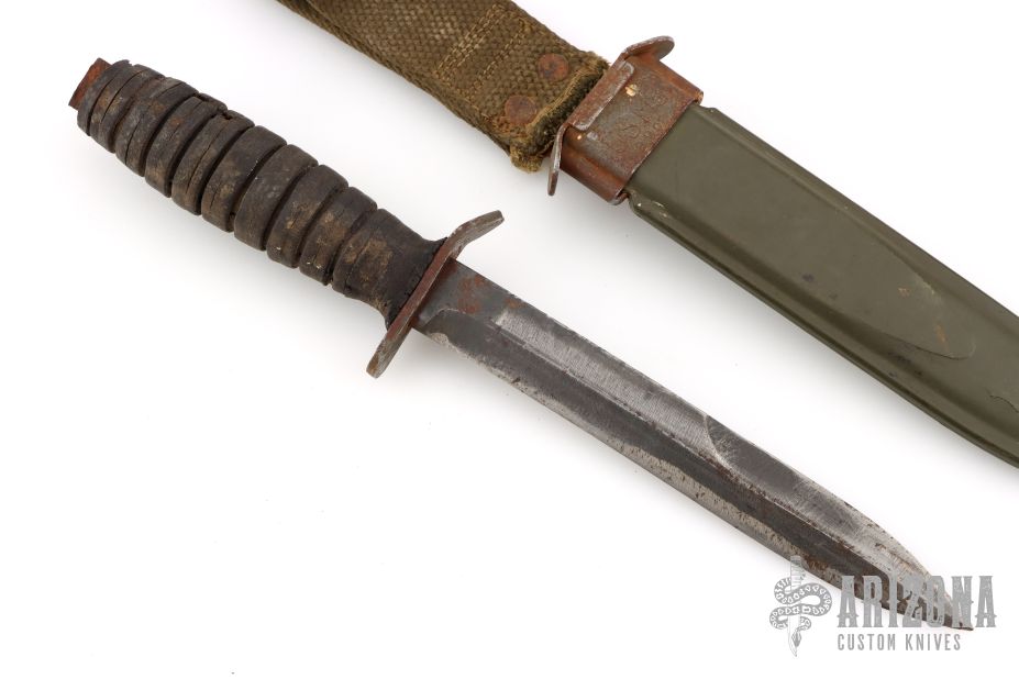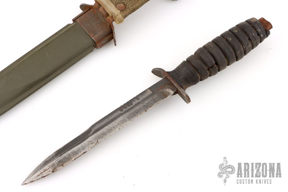 This M3 from Imperial features a black bayonet ground blade with sharpened top edge, .186" blade stock and .875" blade depth, hidden tang construction. The handle has a steel guard and butt, and a stacked leather grip. Comes with USM3 BMCO scabbard with belt loop. This vintage knife has been used, has rust, carried and resharpened, otherwise in fair condition for its age. Marked "US Utica M-3" on the front of the guard.