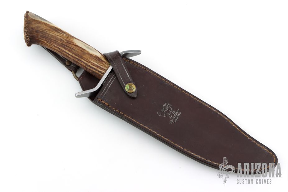 This Bowie by Hen & Rooster Knives features a satin finished blade with fileworked spine, .176" blade stock and 2.101" blade depth, hidden tang construction. The handle has a stainless steel guard and a crown stag grip. Comes with a brown leather sheath. Has some oxidation and scuffs, great shape overall.