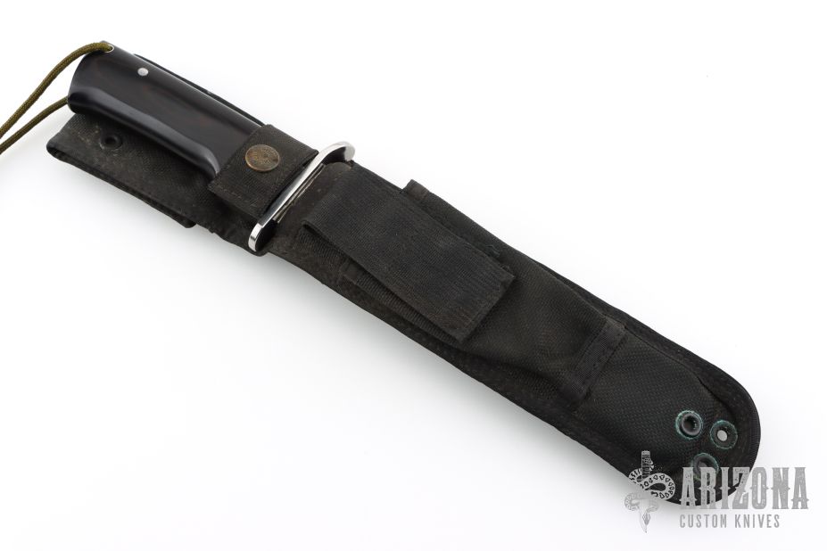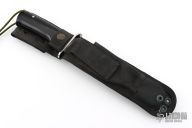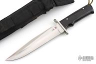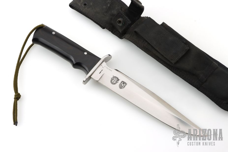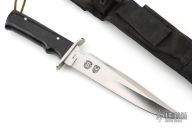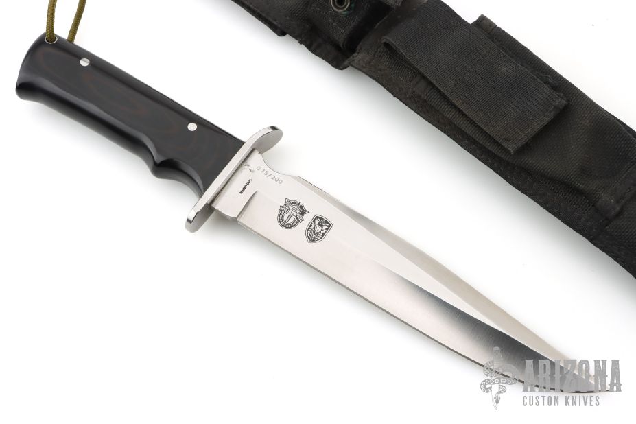 This Model 4008-B SF-SOG Special OPS knife from Al Mar features a satin finished blade with false top edge, .233" blade stock and 1.422" blade depth, full tang construction. The handle has a stainless steel guard and black paper micarta handles with lanyard tube in pommel. Includes black nylon sheath. #075/200. Has some light marks, excellent condition.