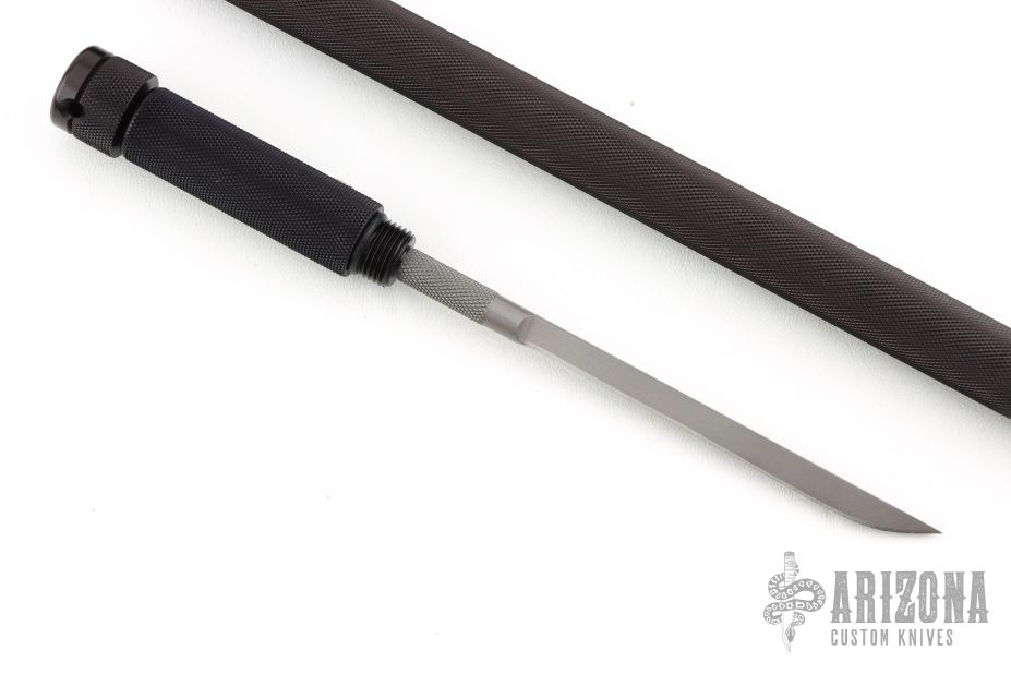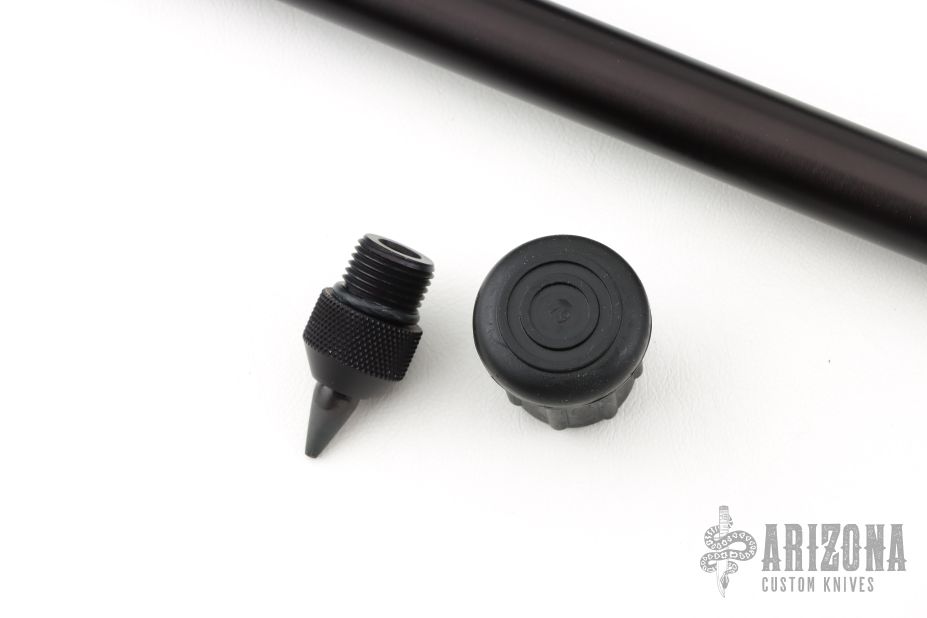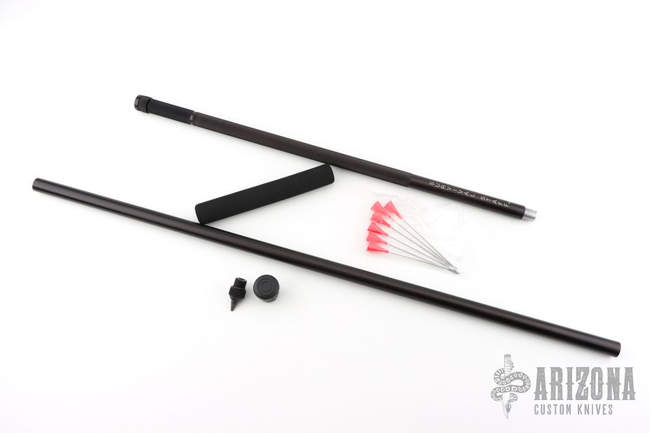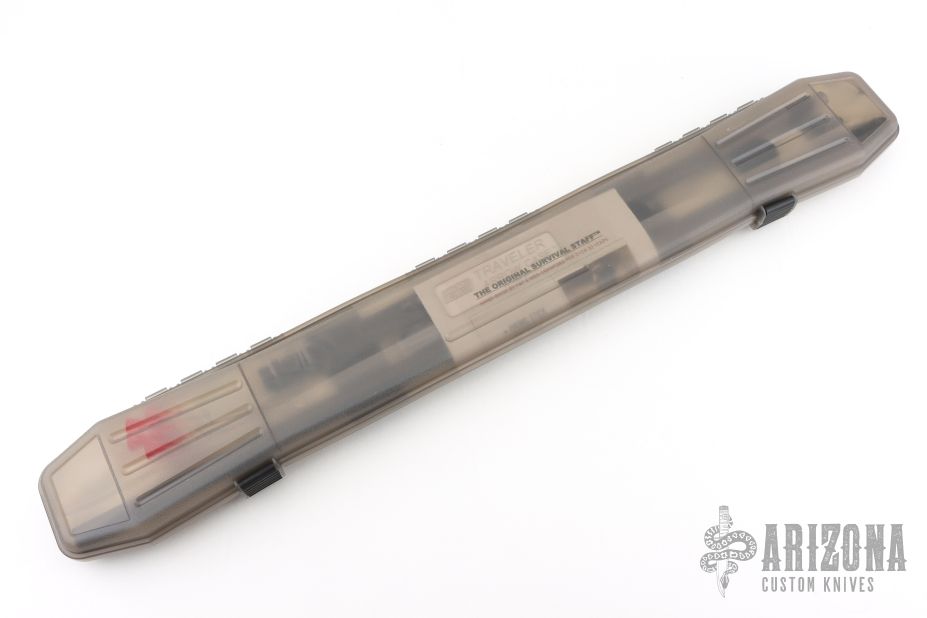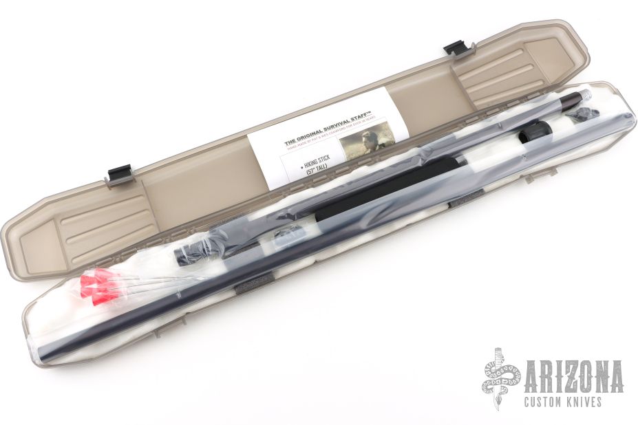 The package is made up of 8 basic parts that can be changed around to make a hiking staff, 57" overall, walking stick, 33" long, or a 24" baton. All parts screw together so that the Survival Staff™ can be changed around to make an effective weapon, or the entire unit can be used for striking. The optional steel head adds more weight for this use. When the basic Staff is put together it weighs 1 lb. 10 oz. All Staffs come with storage case. New from maker!