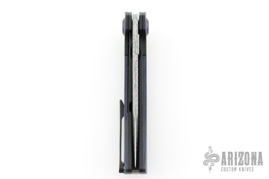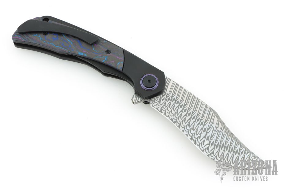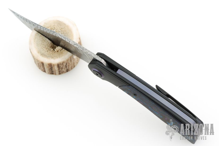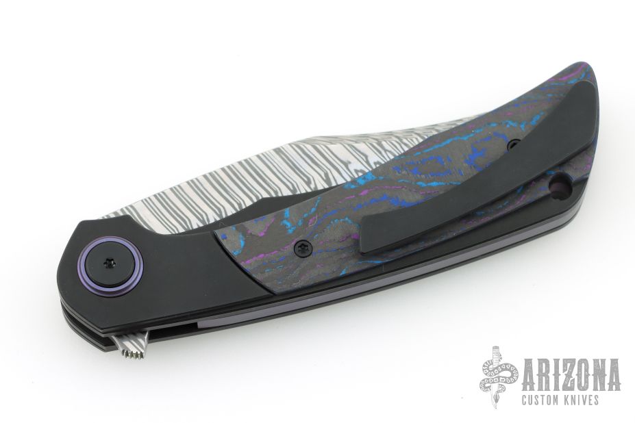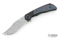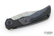 This Sandbar Sabotage by Black Snow and Lee Lerman features a Fafnir Damasteel blade with notched flipper. The handle features black PVD titanium bolsters/liners/pocket clip, black/blue CamoCarbon scales, anodized titanium backspacer. Anodized titanium pivot collars. Comes with original box and zippered case. Still sealed in bag. NEW condition.