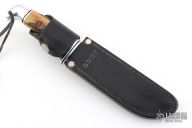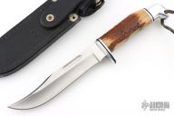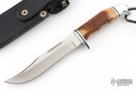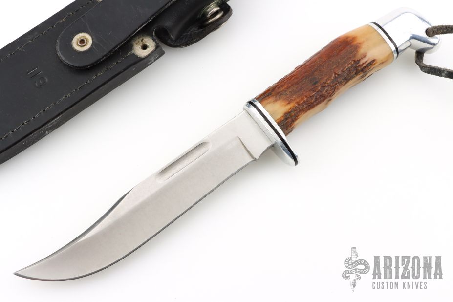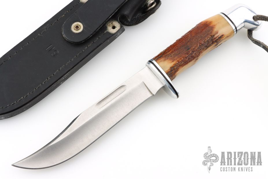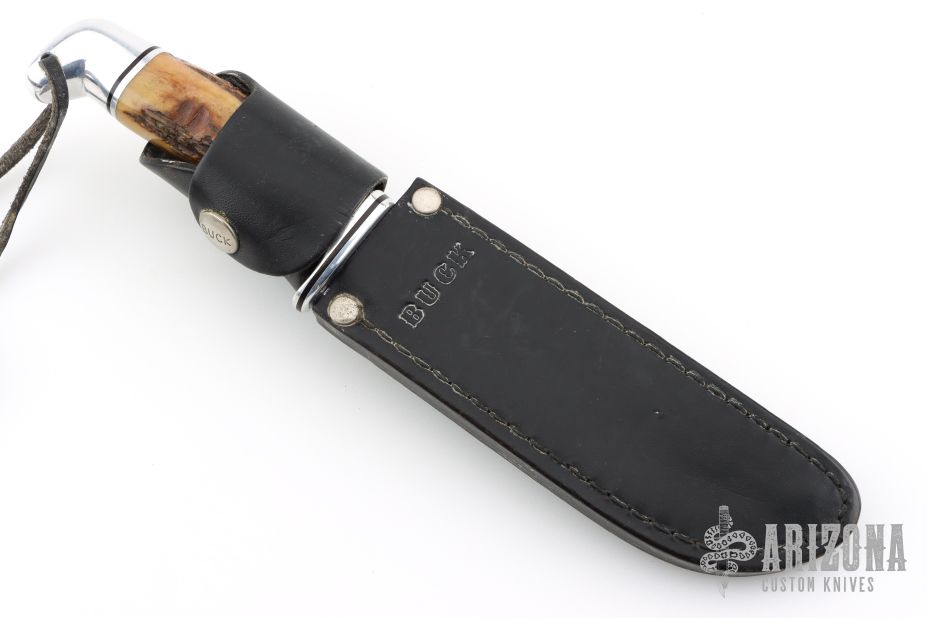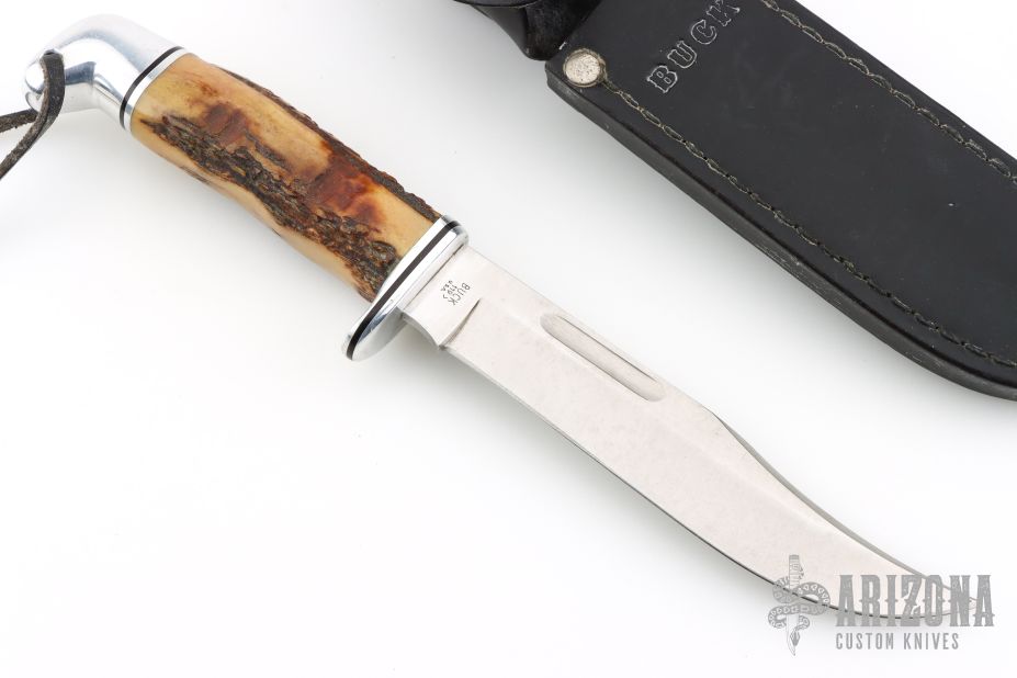 This Model 119 by Buck Knives features a satin finished clip point blade with false top edge and fullers, .178" blade stock and 1.111" blade depth, hidden tang construction. The handle has an aluminum guard and butt, and a stag grip. Comes with original black leather sheath. Has light scratches, otherwise good condition.