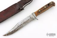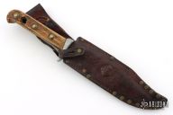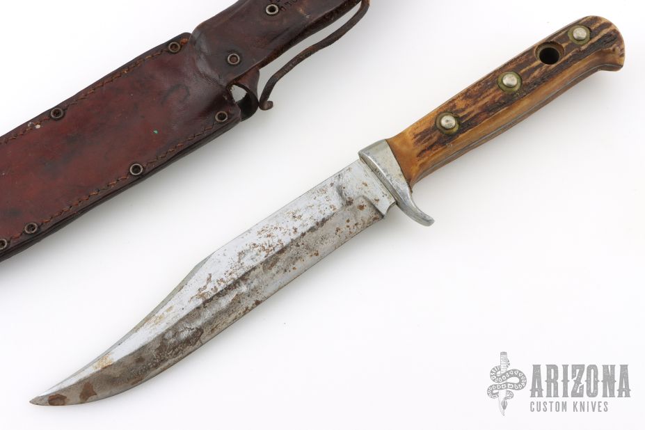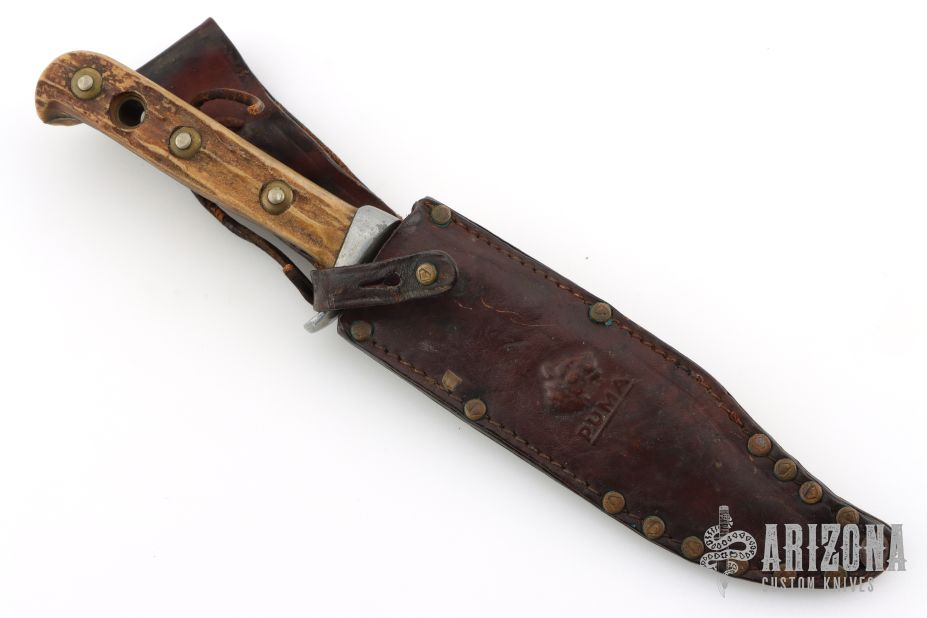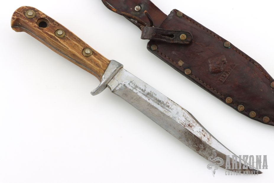 This bowie by Puma features a satin finished clip point blade with false top edge, .175" blade stock and 1.115" blade depth, full tang construction. The handle has an aluminum guard and stag scales with rivets. Comes with brown leather sheath with rivets. #63171 on guard. Has scratches and oxidation, has been used and sharpened, poor condition.