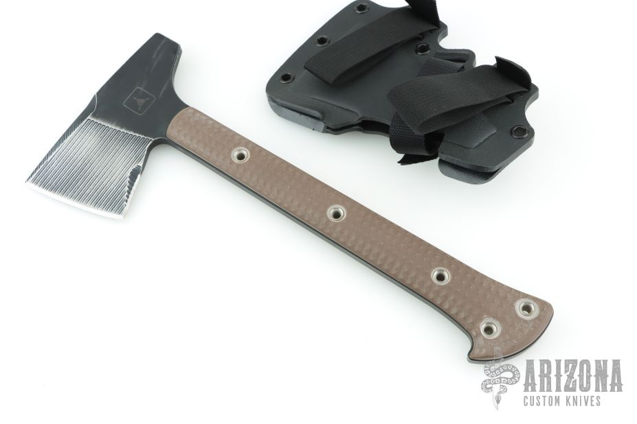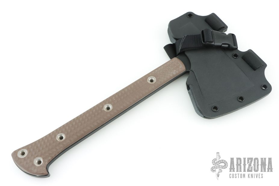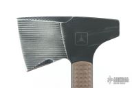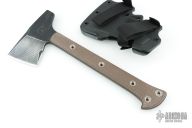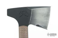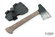 Jenny Wren is the traditional name for a small, brownish-grey bird found in the Northern hemisphere. Its covert colors help it to disappear into its surroundings and its highly adaptive nature makes it a tenacious creature in new environments. These characteristics spawned the namesake for RMJ’s Jenny Wren - a no-nonsense hawk that is a lightweight and compact field tool with a wickedly aggressive profile. Developed to meet the requirements of a fixed blade knife in weight while retaining the tenacity and psychological advantage of a tomahawk, our RMJ Jenny Wren TAD Edition is a rare opportunity to get your hands on one of these hand crafted masterpieces. Features: -The Chrome-Moly 4140 steel construction combined with a skeletonized tang results in a tomahawk that is nearly indestructible. -Exclusively available through Triple Aught Design is the hammer-poll head. Benefiting from the small footprint and low weight of this tool, the user will feel less of a drain on the body and a speed advantage during use and will enjoy the easy accessibility of having an axe and a hammer during camp prep. -Unique in its size, the Jenny Wren is small, but incredibly intimidating psychologically. This advantage makes it useful for situations where carrying a gun for self-defense is not an option. -The bottom eject, jump-ready Kydex scabbard has been updated with a flared opening. This additional flare makes for easy indexing of the blade once your task is complete. The scabbard can be configured as a sling or shoulder strap for easy carry. -The latest variation of our Jenny Wren TAD Edition exhibits field-ready upgrades to include: -Shortened beard to allow the user to choke up on the axe for fine detailed work without fear of catching the blade -Extended pinky catch for added stability during aggressive and heavy chopping. Blade Steel: Chrome-Moly 4140 steel