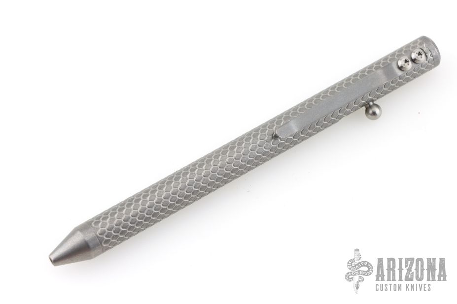 This unique bolt-action pen is made completely of titanium with the only exceptions being the ink cartridge, and the spring. Pen is new from Mr. Fellhoelter and comes in original plastic storage tube.