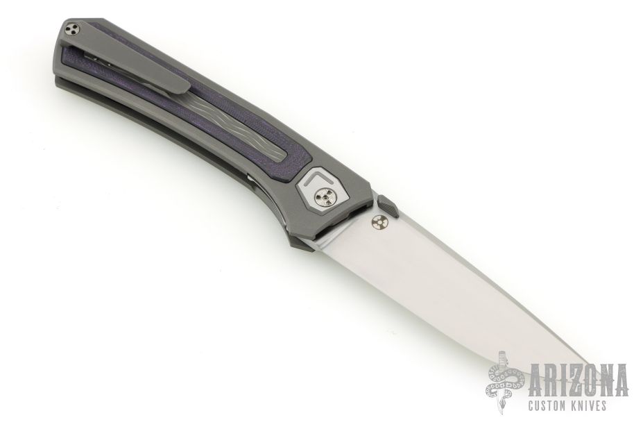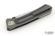 This NM1 by Todd Rexford features a hand-rubbed MagnaCut blade, showcasing exceptional craftsmanship and performance. The handle is built from a faceted titanium frame with a striking wave-pattern center, complemented by an inlaid purple CarboTi scale for added visual contrast.