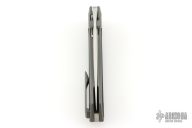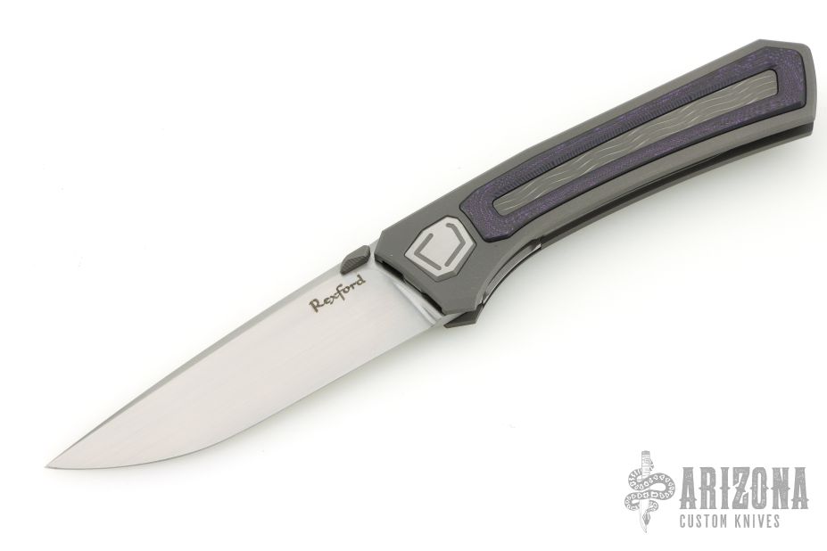 It is outfitted with a .250 stainless geometric pivot and matching grooved hardware, along with an inlaid hardened stainless lockbar insert and detent pin for durability. The knife rides on Rexford’s large radius bearing system for smooth, reliable action and features his signature circle logo pivot screw.